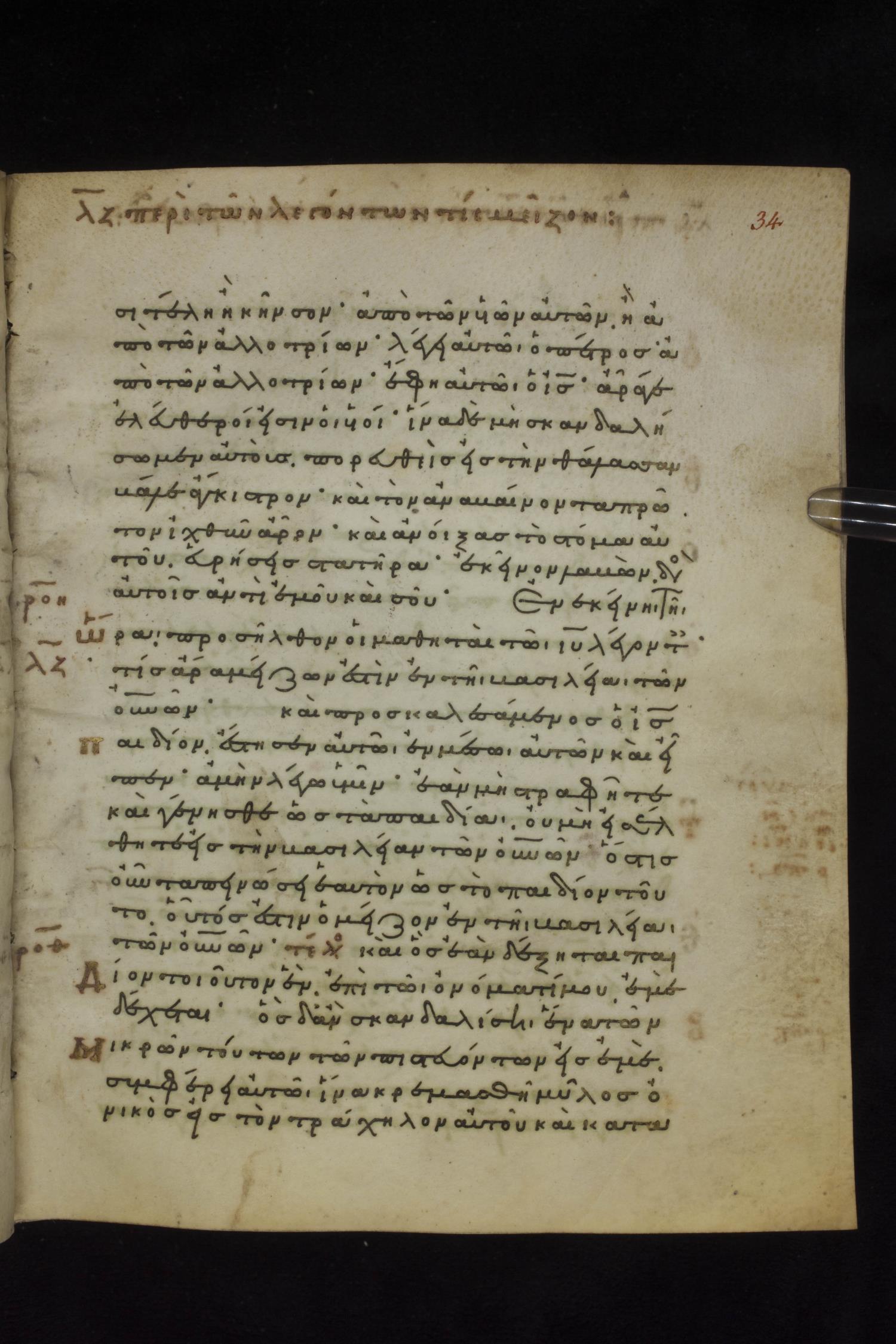 Eleventh century minuscule of the Gospels on parchment; 231 leaves, 1 column, 24 lines per column. Images were taken at the National Library of Greece in Athens.