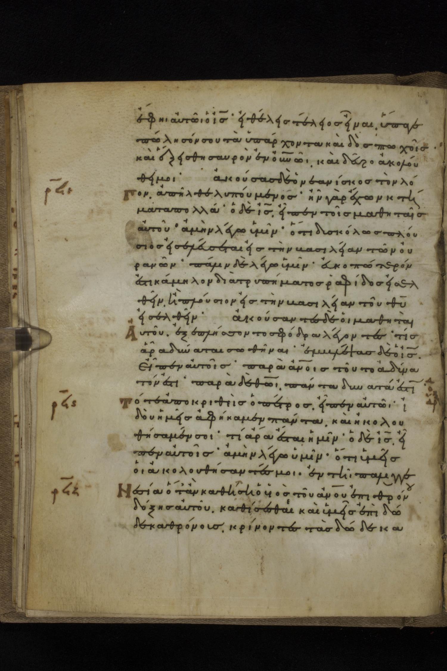 Eleventh century minuscule of the Gospels on parchment; 231 leaves, 1 column, 24 lines per column. Images were taken at the National Library of Greece in Athens.