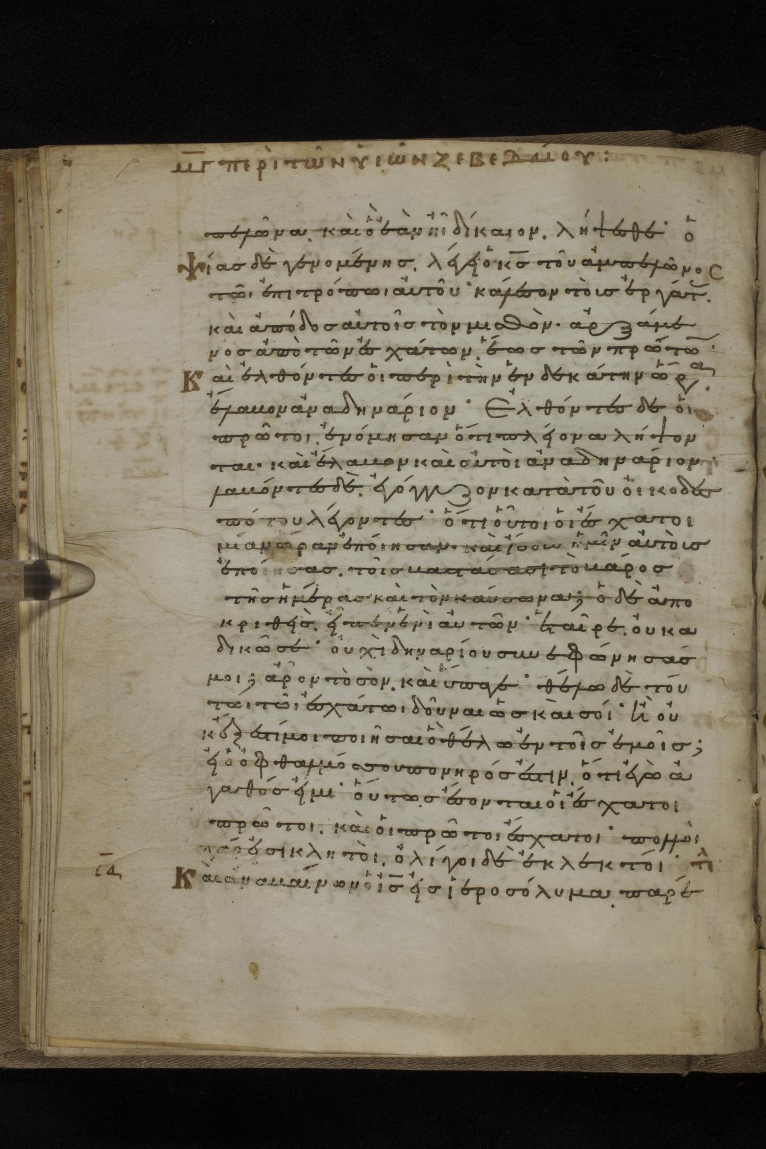 Eleventh century minuscule of the Gospels on parchment; 231 leaves, 1 column, 24 lines per column. Images were taken at the National Library of Greece in Athens.