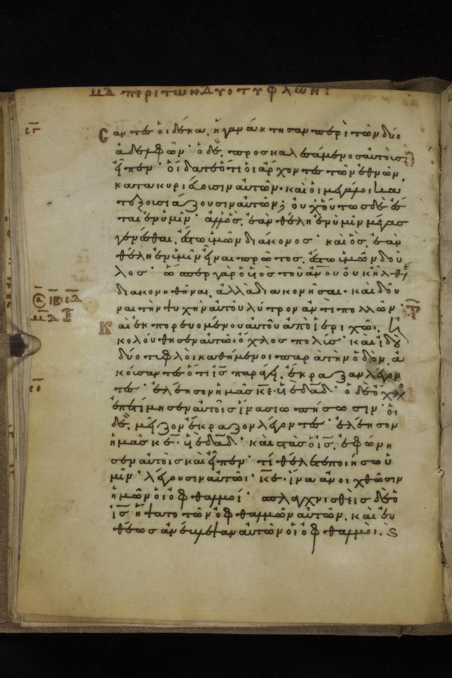 Eleventh century minuscule of the Gospels on parchment; 231 leaves, 1 column, 24 lines per column. Images were taken at the National Library of Greece in Athens.