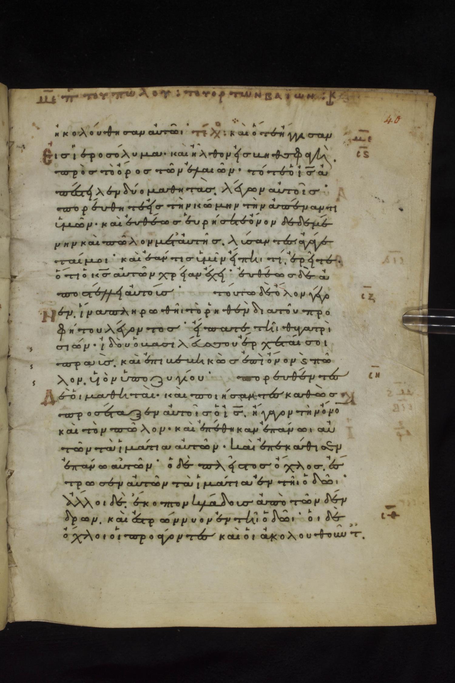 Eleventh century minuscule of the Gospels on parchment; 231 leaves, 1 column, 24 lines per column. Images were taken at the National Library of Greece in Athens.