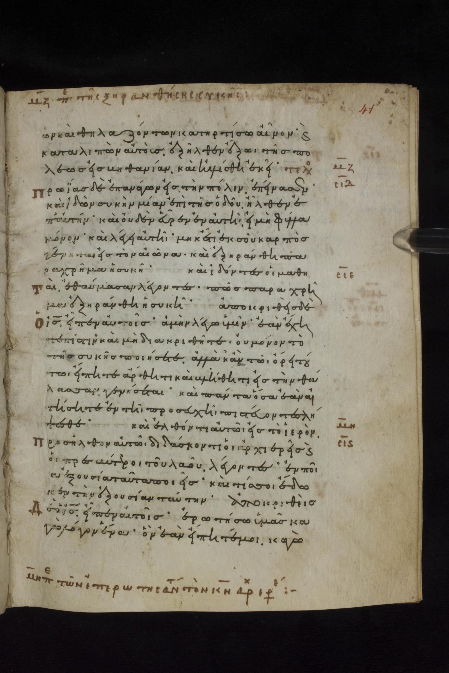 Eleventh century minuscule of the Gospels on parchment; 231 leaves, 1 column, 24 lines per column. Images were taken at the National Library of Greece in Athens.