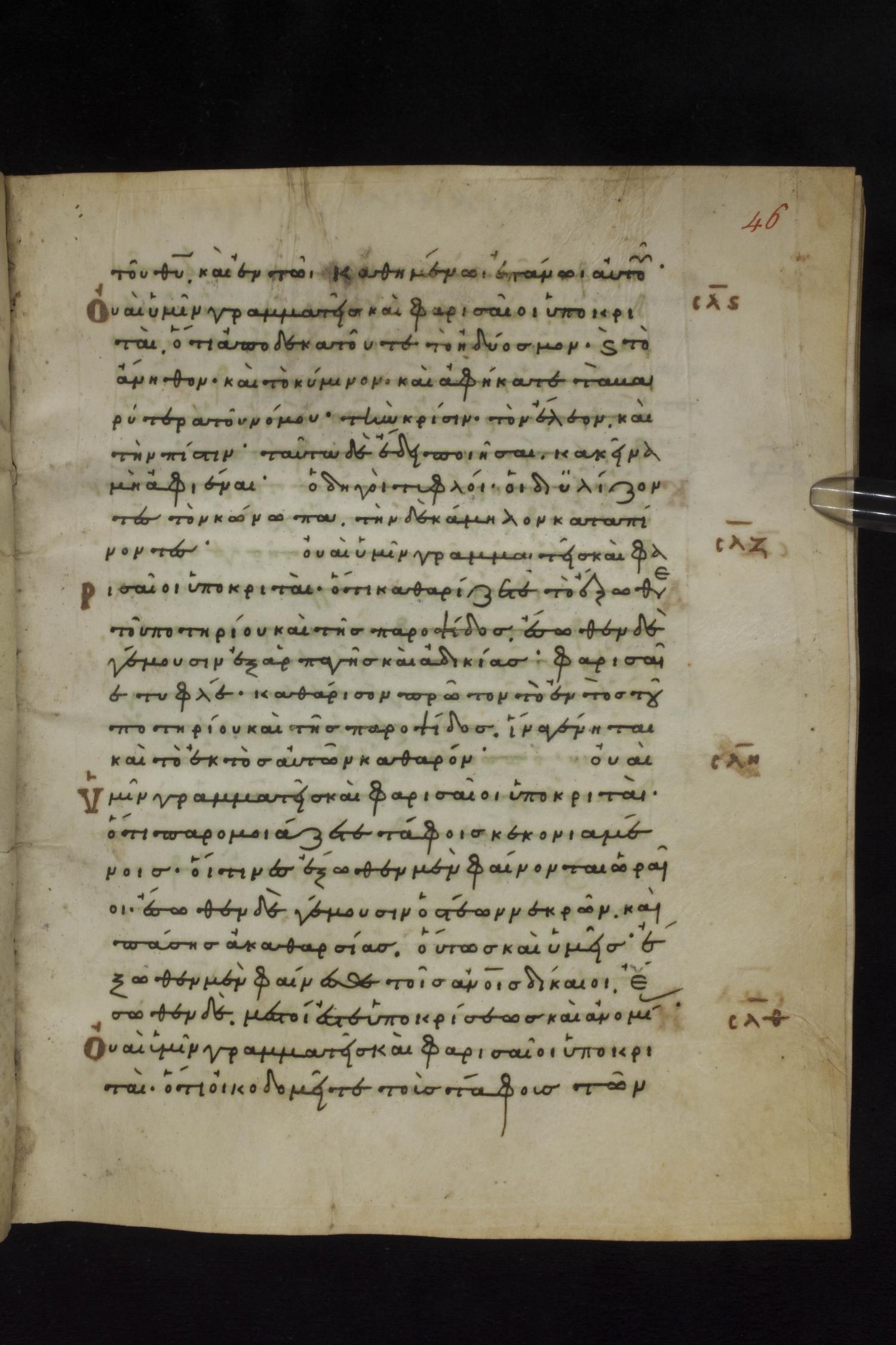 Eleventh century minuscule of the Gospels on parchment; 231 leaves, 1 column, 24 lines per column. Images were taken at the National Library of Greece in Athens.