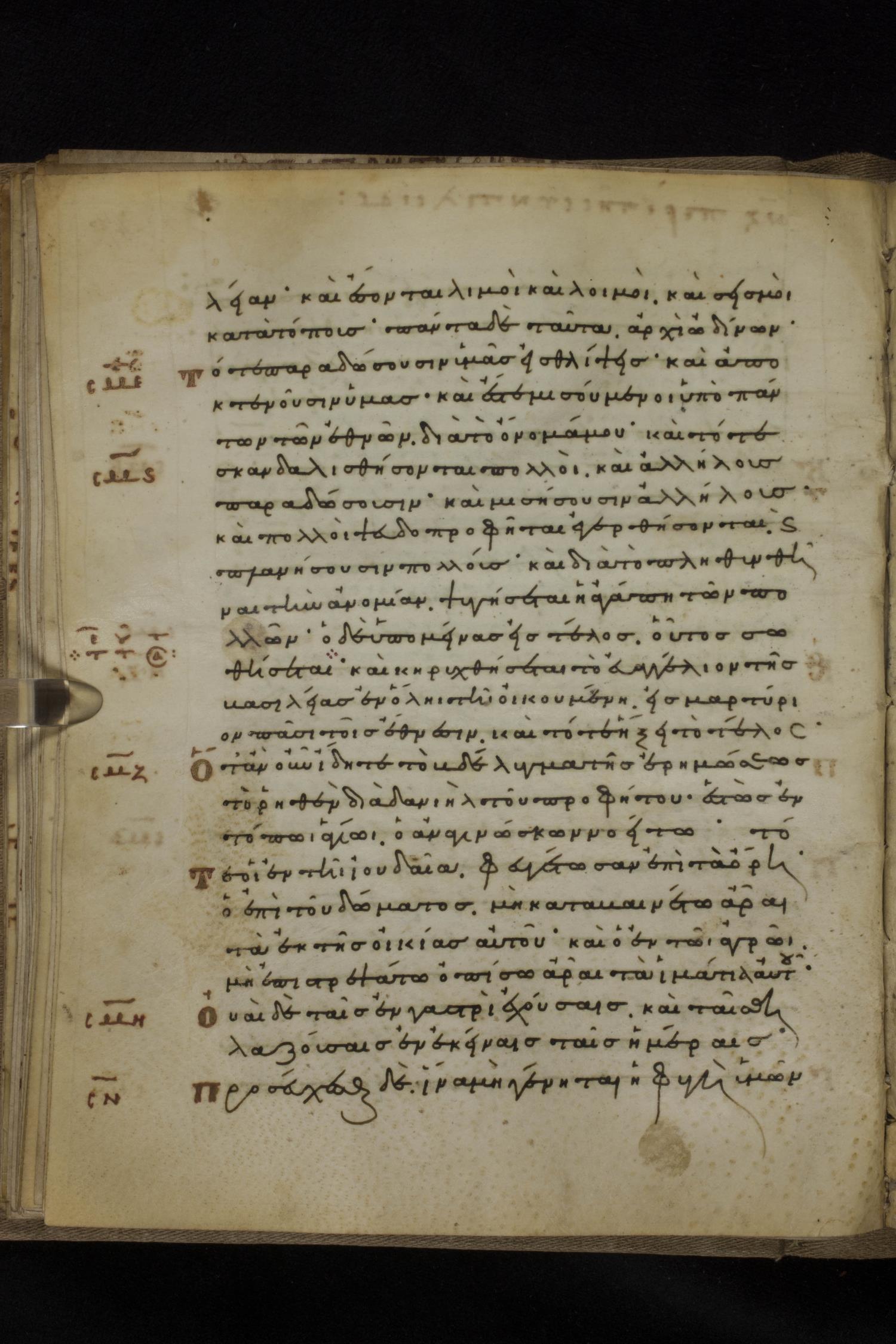 Eleventh century minuscule of the Gospels on parchment; 231 leaves, 1 column, 24 lines per column. Images were taken at the National Library of Greece in Athens.