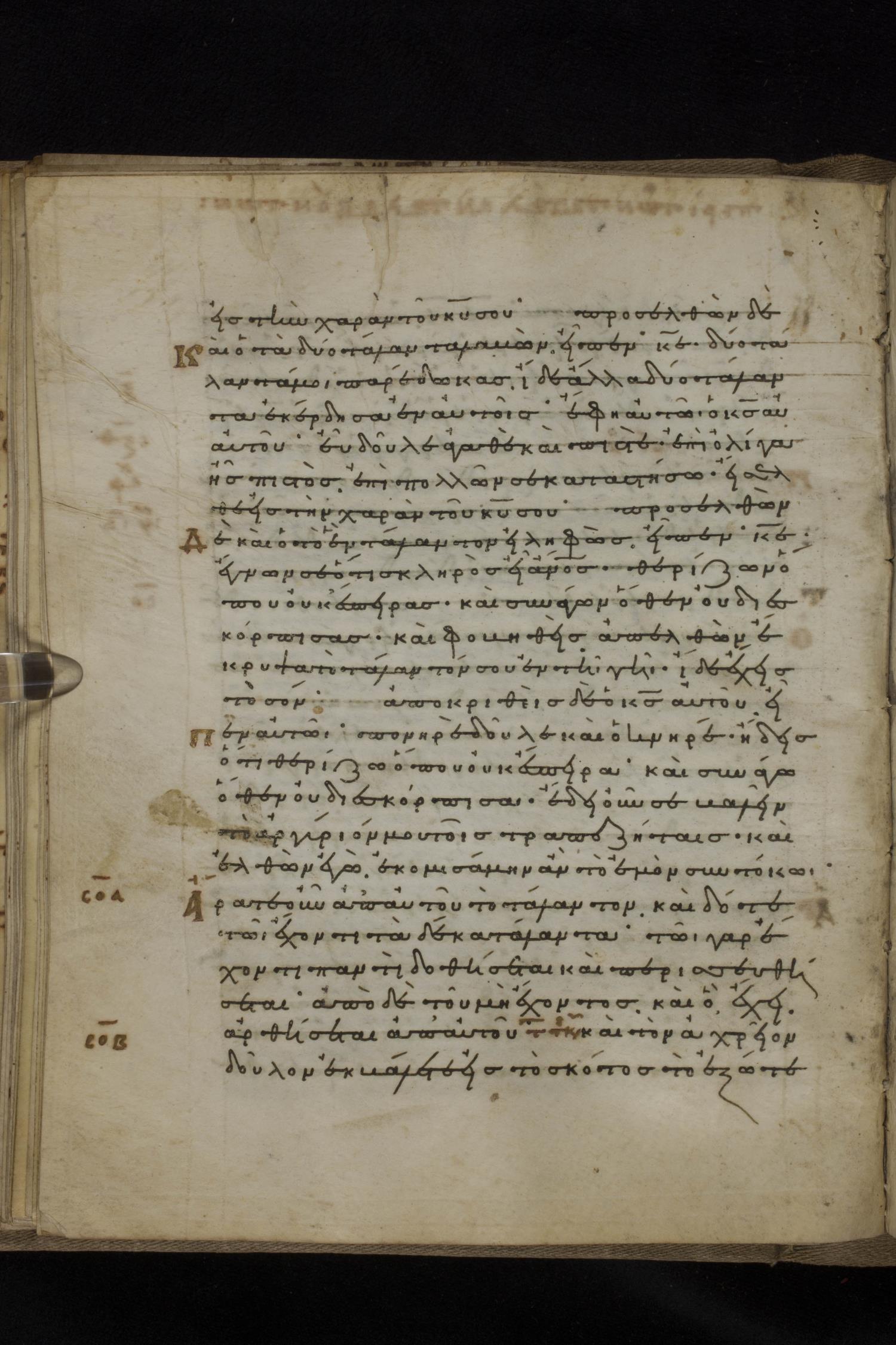 Eleventh century minuscule of the Gospels on parchment; 231 leaves, 1 column, 24 lines per column. Images were taken at the National Library of Greece in Athens.