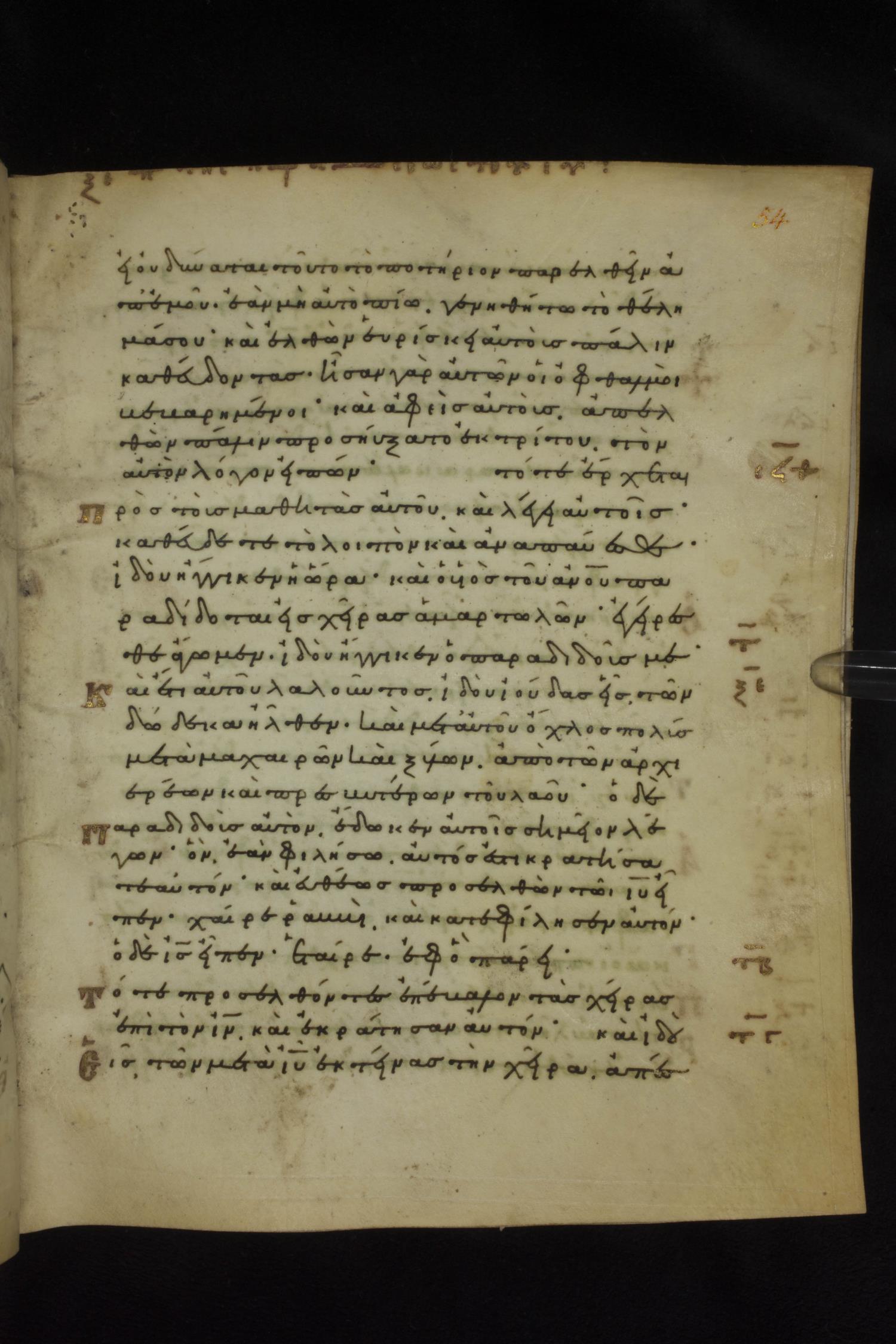 Eleventh century minuscule of the Gospels on parchment; 231 leaves, 1 column, 24 lines per column. Images were taken at the National Library of Greece in Athens.
