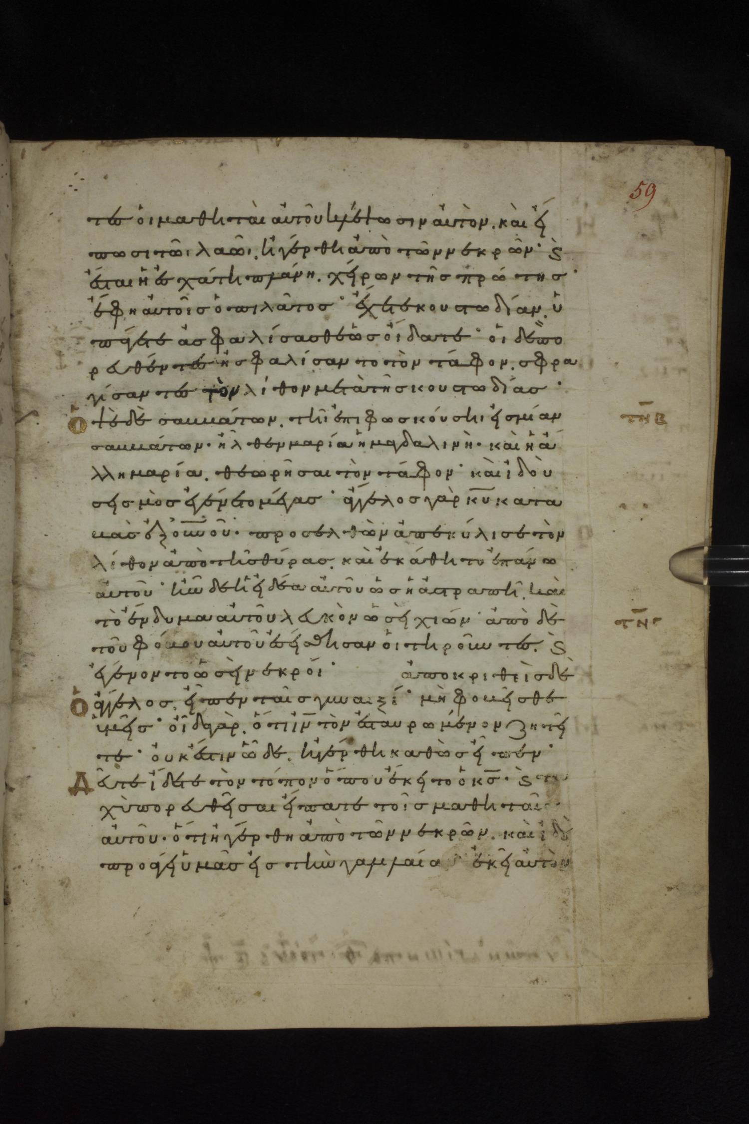 Eleventh century minuscule of the Gospels on parchment; 231 leaves, 1 column, 24 lines per column. Images were taken at the National Library of Greece in Athens.