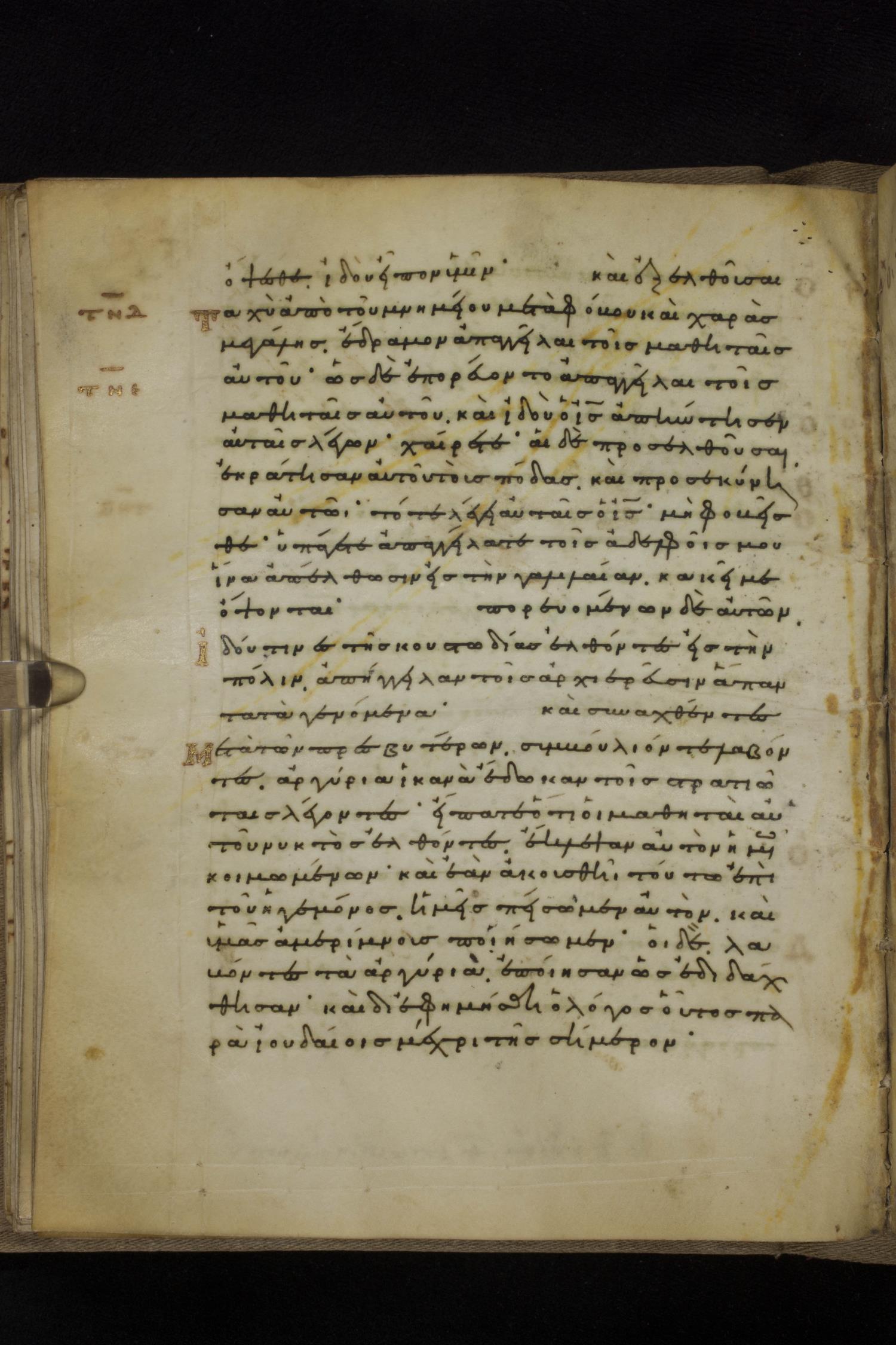 Eleventh century minuscule of the Gospels on parchment; 231 leaves, 1 column, 24 lines per column. Images were taken at the National Library of Greece in Athens.