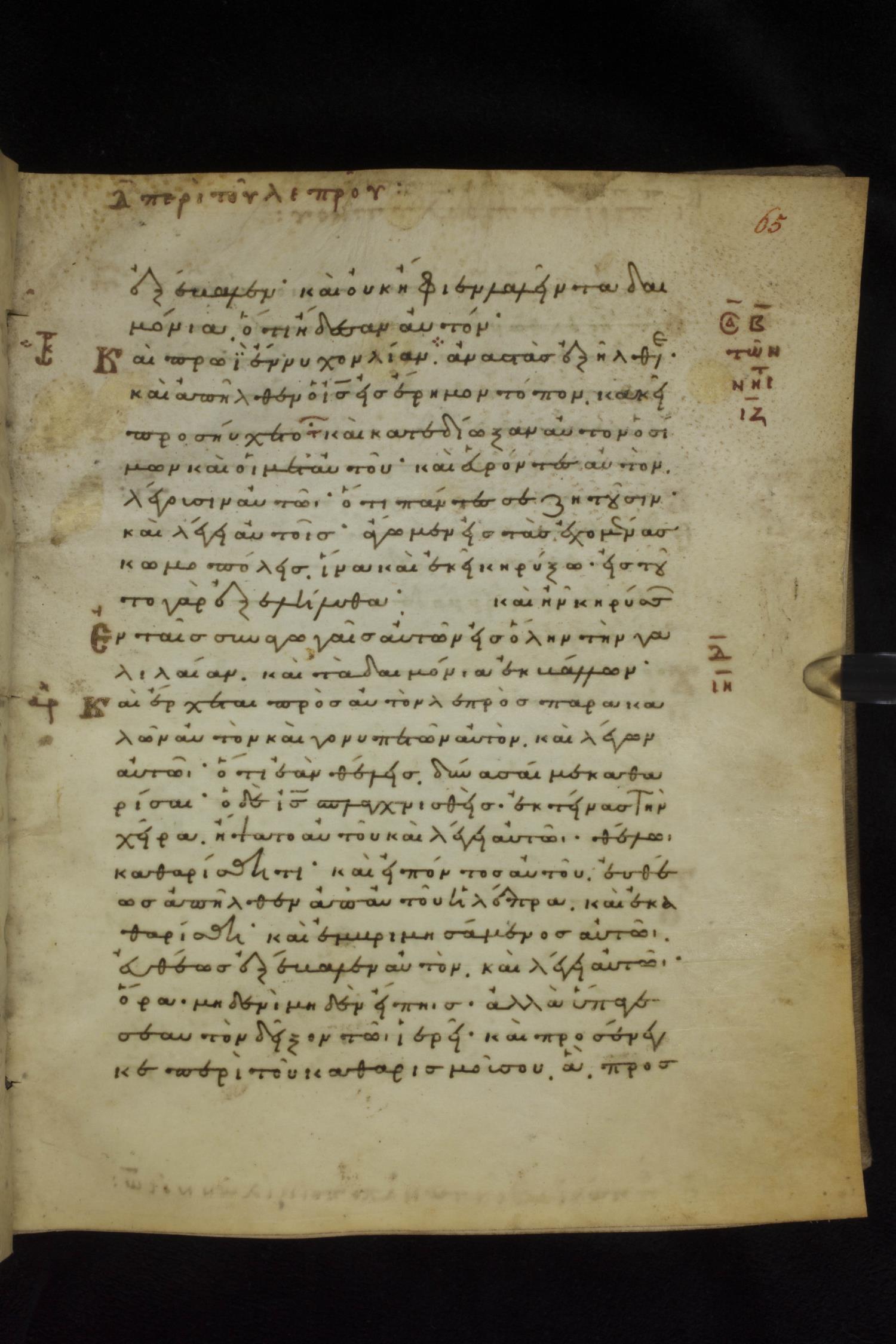 Eleventh century minuscule of the Gospels on parchment; 231 leaves, 1 column, 24 lines per column. Images were taken at the National Library of Greece in Athens.