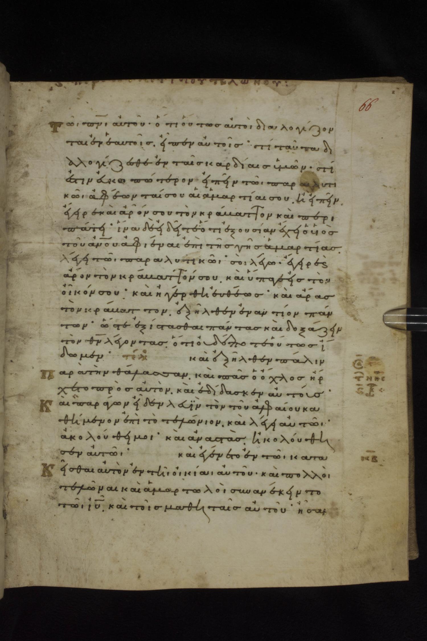 Eleventh century minuscule of the Gospels on parchment; 231 leaves, 1 column, 24 lines per column. Images were taken at the National Library of Greece in Athens.