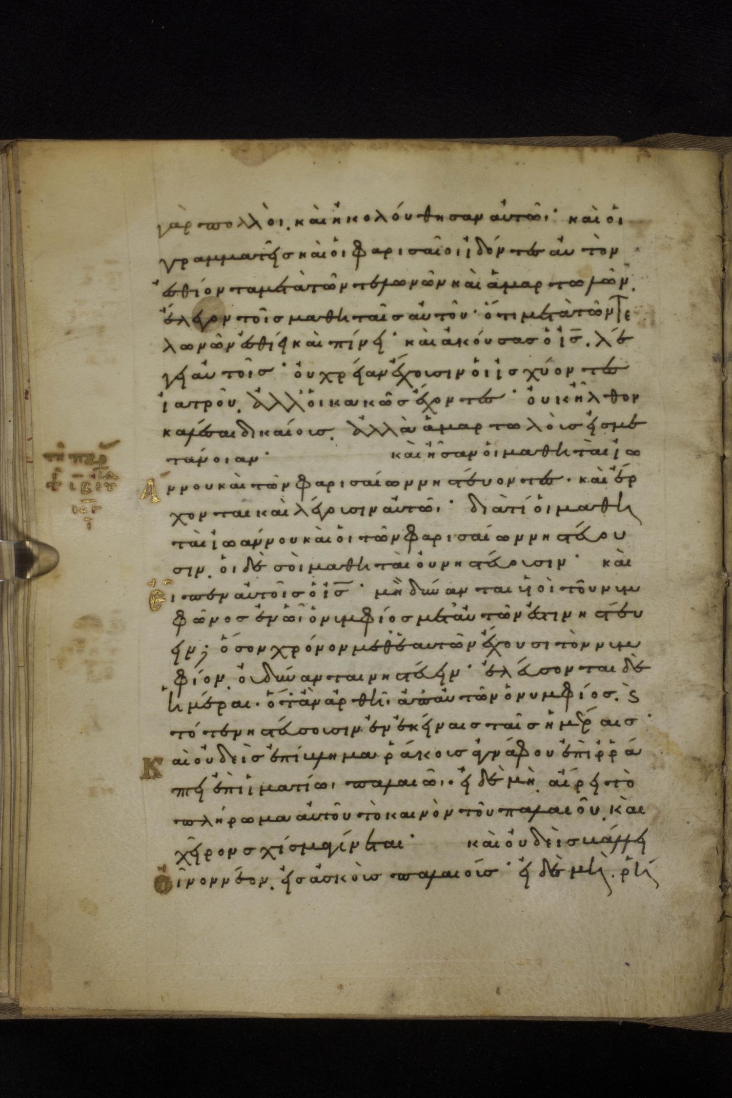 Eleventh century minuscule of the Gospels on parchment; 231 leaves, 1 column, 24 lines per column. Images were taken at the National Library of Greece in Athens.
