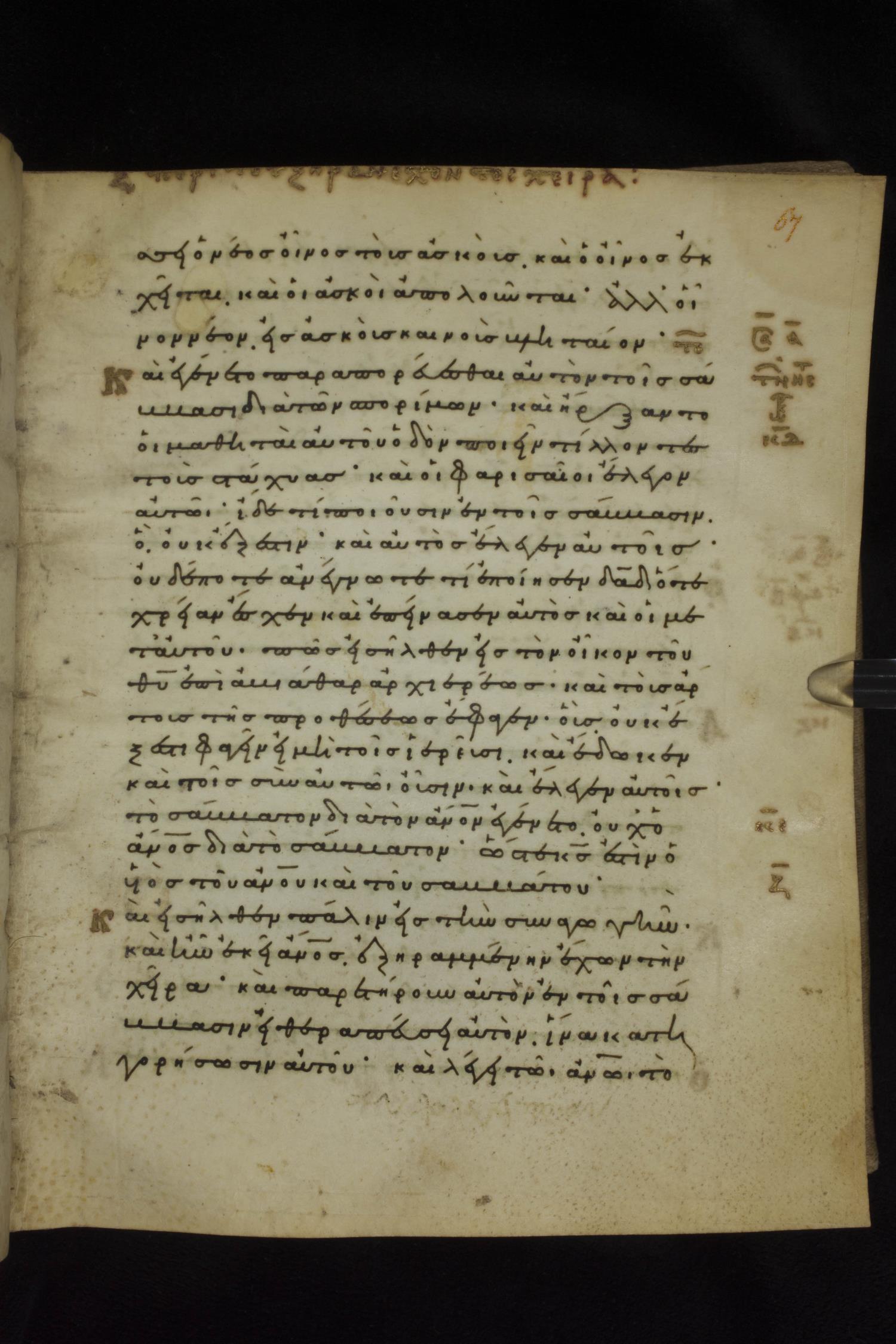 Eleventh century minuscule of the Gospels on parchment; 231 leaves, 1 column, 24 lines per column. Images were taken at the National Library of Greece in Athens.