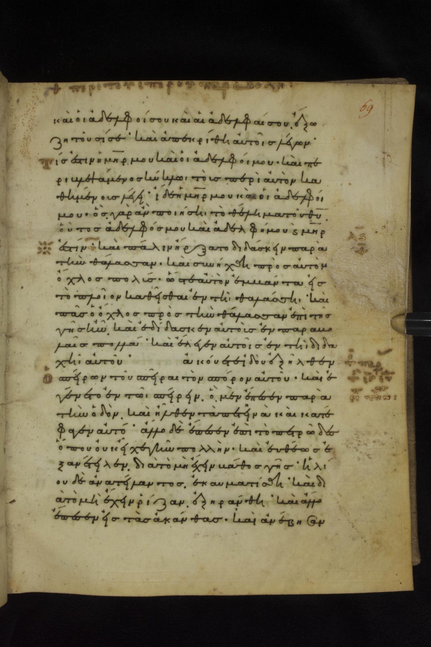 Eleventh century minuscule of the Gospels on parchment; 231 leaves, 1 column, 24 lines per column. Images were taken at the National Library of Greece in Athens.