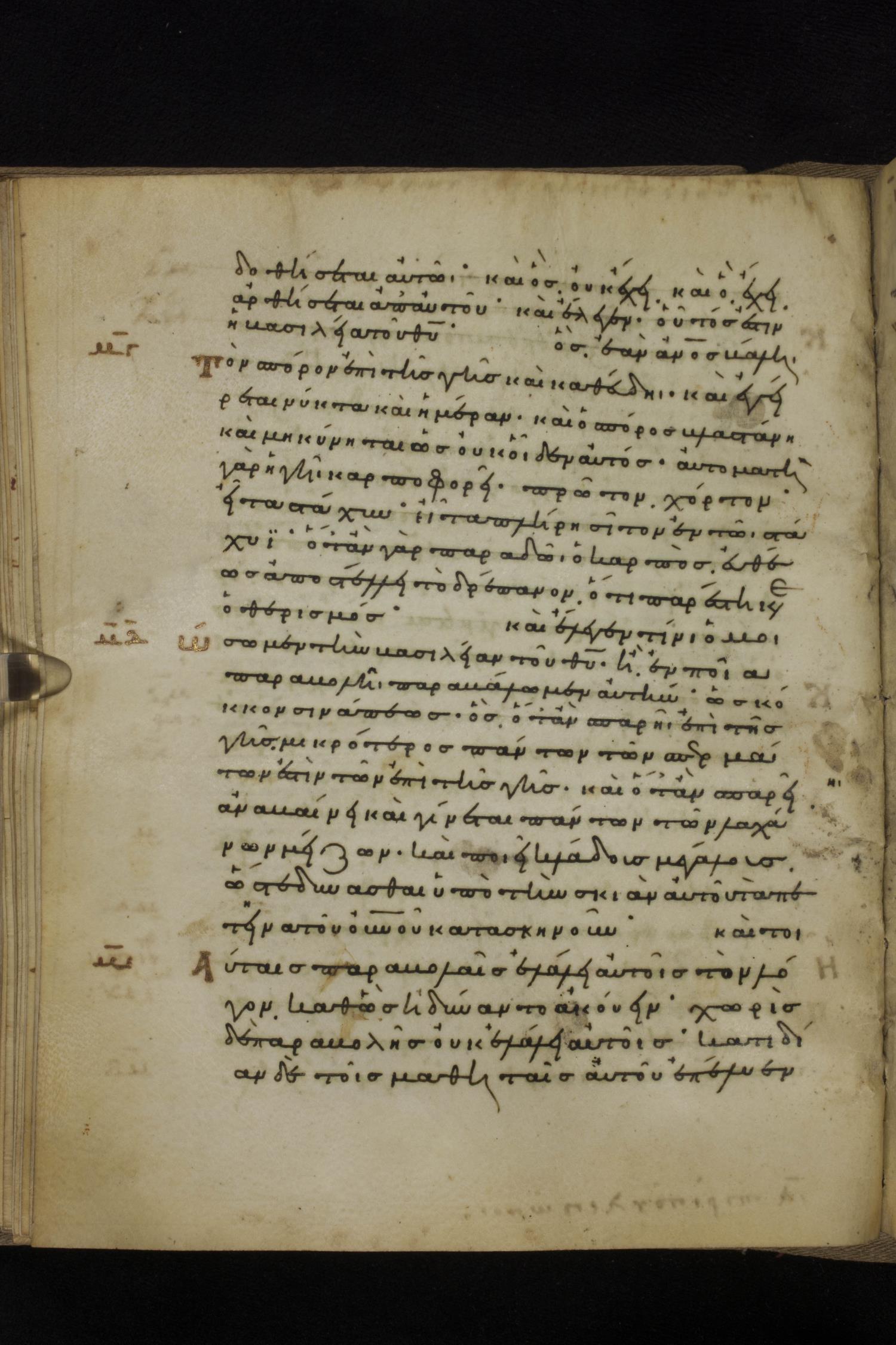 Eleventh century minuscule of the Gospels on parchment; 231 leaves, 1 column, 24 lines per column. Images were taken at the National Library of Greece in Athens.