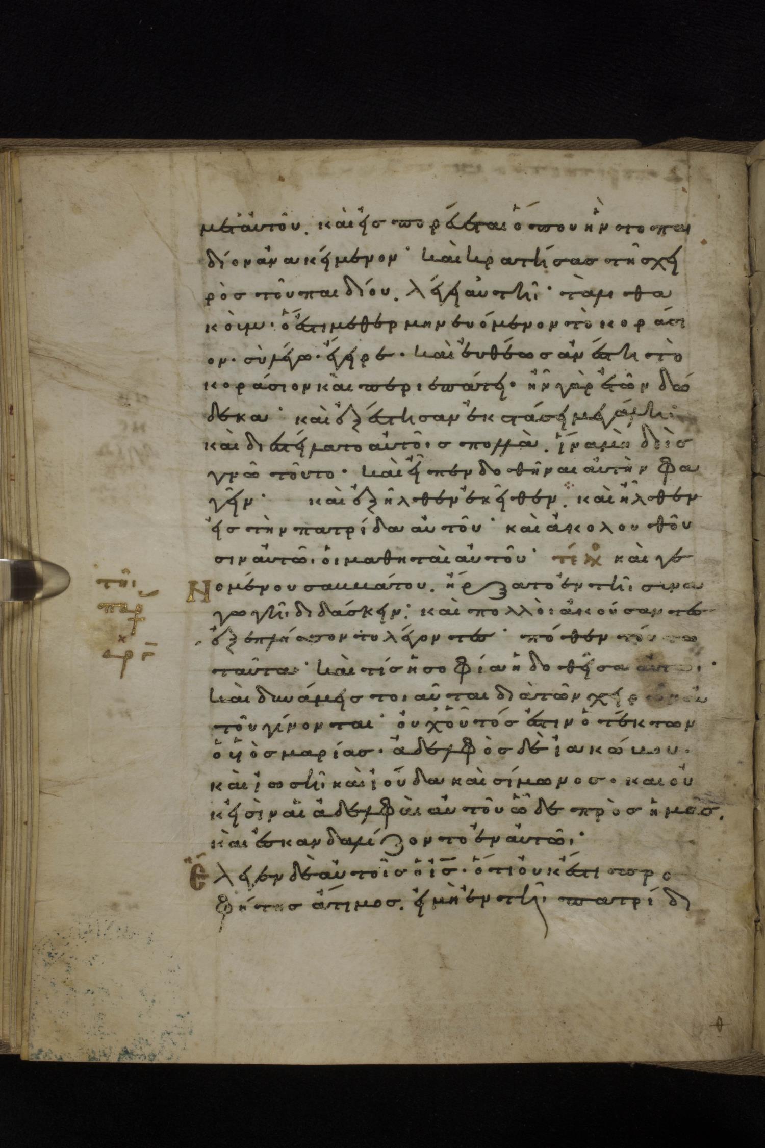 Eleventh century minuscule of the Gospels on parchment; 231 leaves, 1 column, 24 lines per column. Images were taken at the National Library of Greece in Athens.