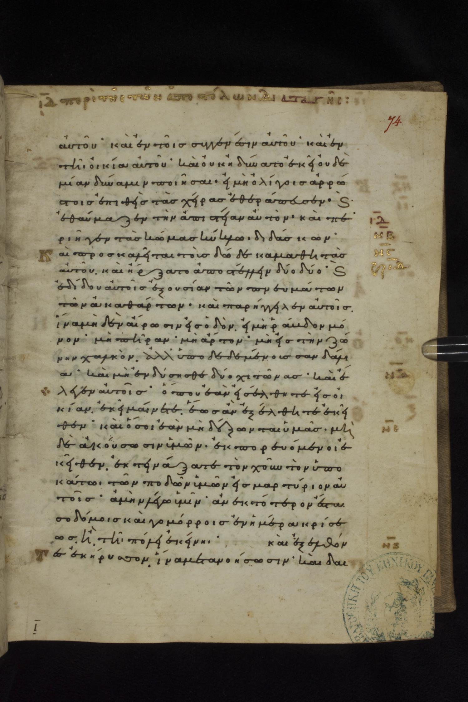 Eleventh century minuscule of the Gospels on parchment; 231 leaves, 1 column, 24 lines per column. Images were taken at the National Library of Greece in Athens.