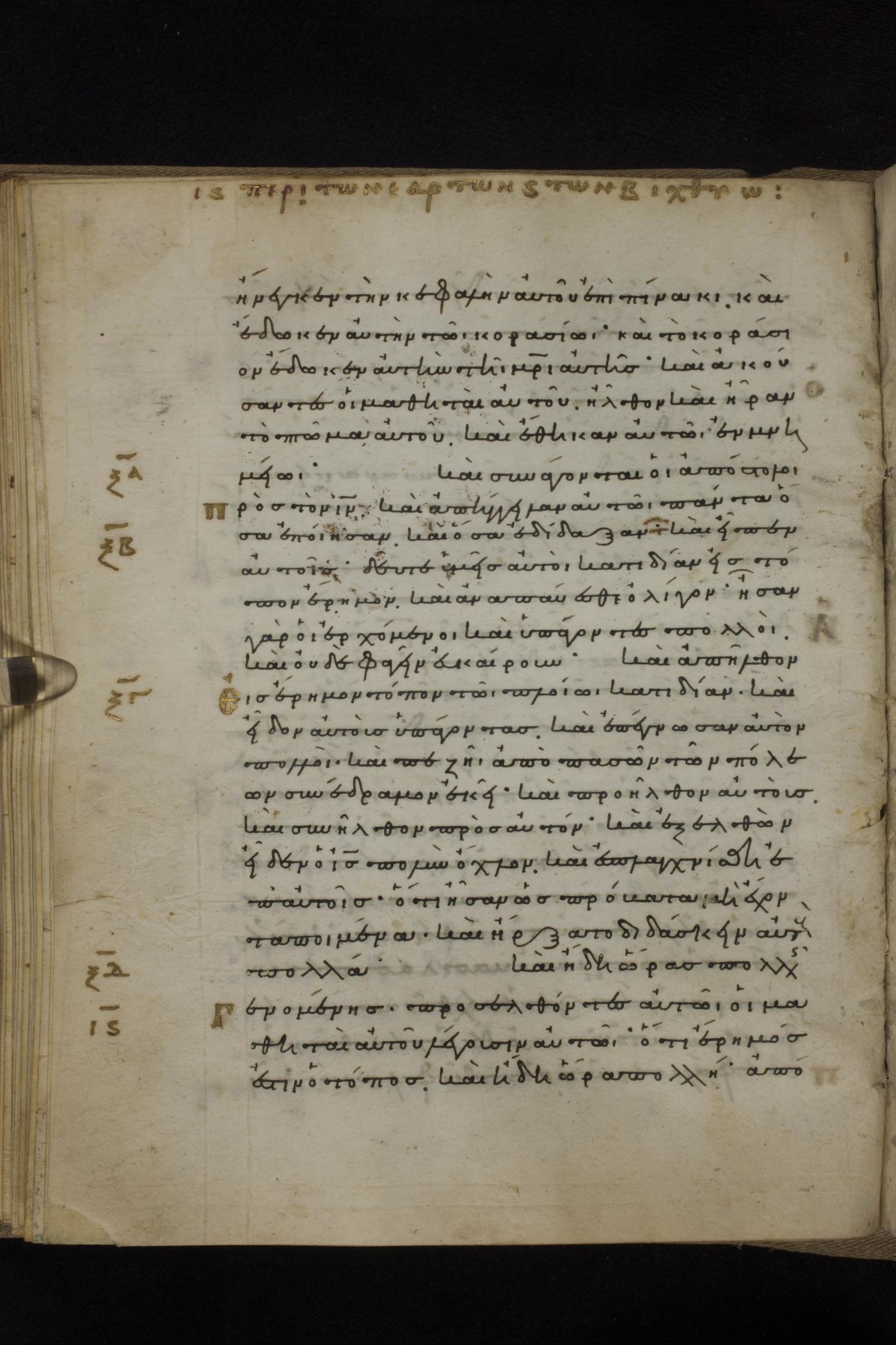 Eleventh century minuscule of the Gospels on parchment; 231 leaves, 1 column, 24 lines per column. Images were taken at the National Library of Greece in Athens.