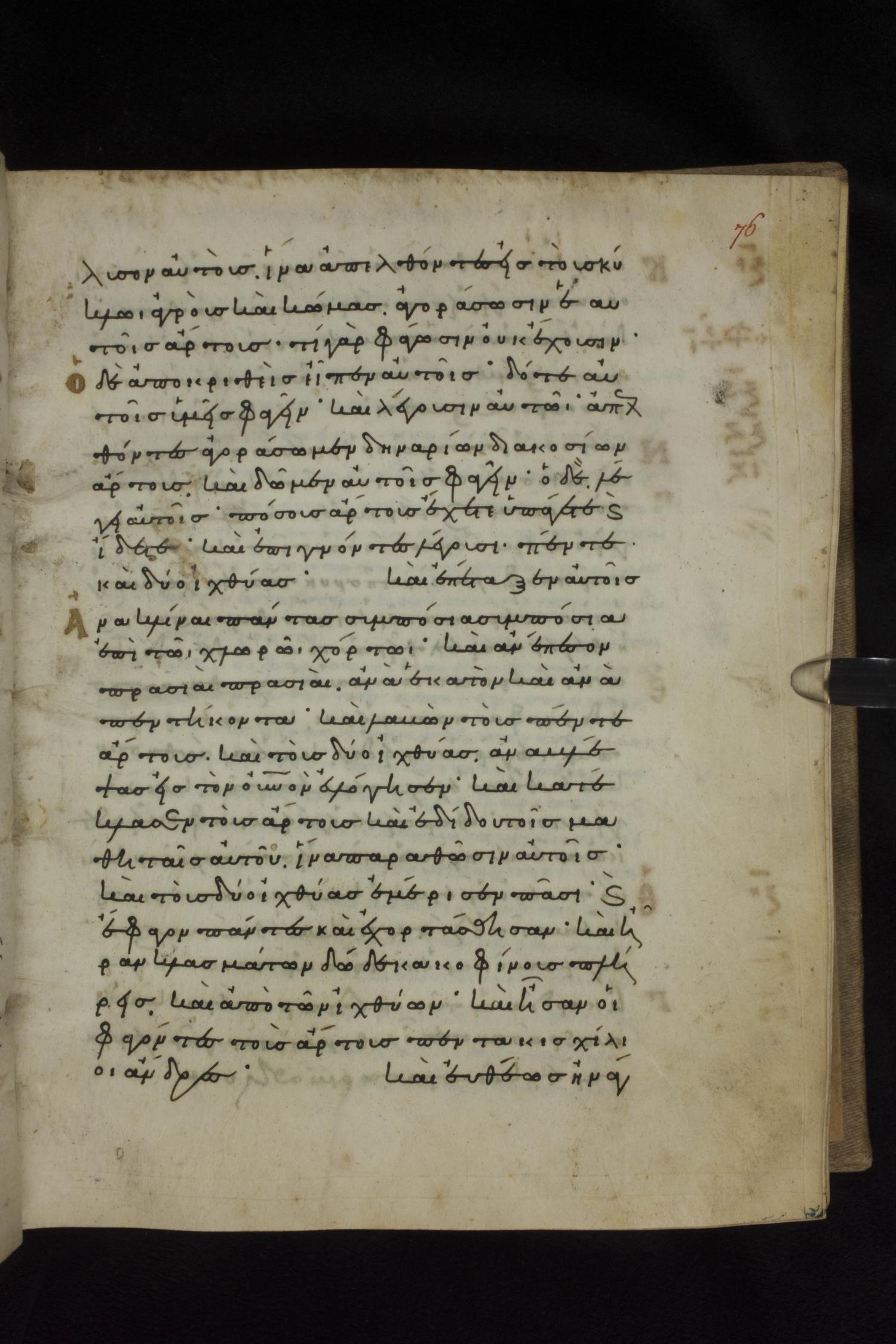 Eleventh century minuscule of the Gospels on parchment; 231 leaves, 1 column, 24 lines per column. Images were taken at the National Library of Greece in Athens.