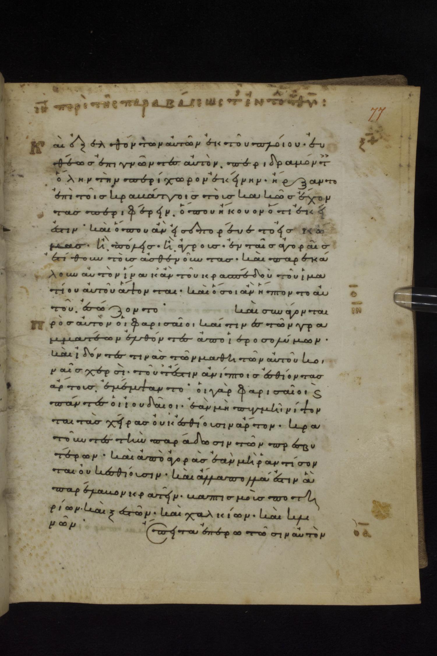 Eleventh century minuscule of the Gospels on parchment; 231 leaves, 1 column, 24 lines per column. Images were taken at the National Library of Greece in Athens.