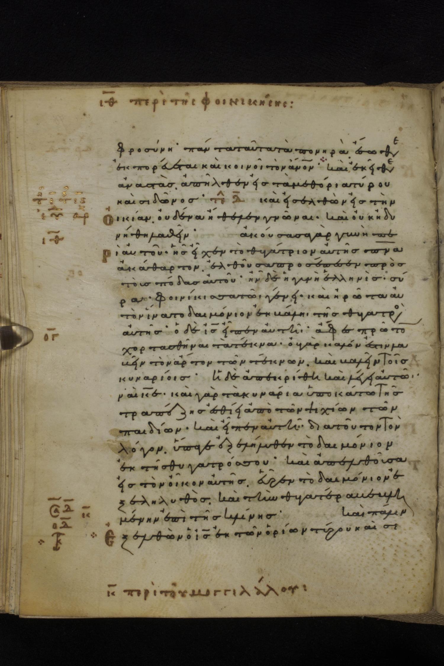 Eleventh century minuscule of the Gospels on parchment; 231 leaves, 1 column, 24 lines per column. Images were taken at the National Library of Greece in Athens.