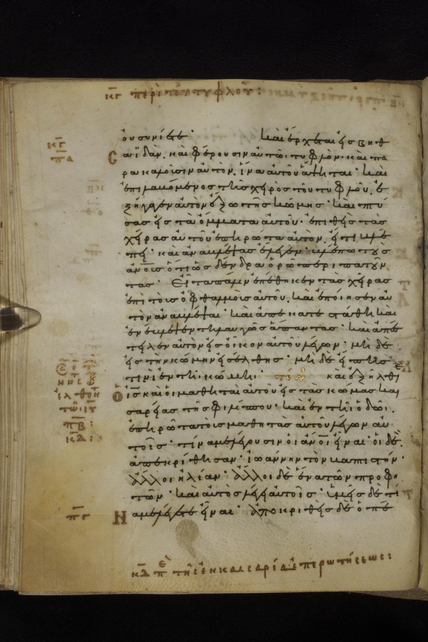 Eleventh century minuscule of the Gospels on parchment; 231 leaves, 1 column, 24 lines per column. Images were taken at the National Library of Greece in Athens.