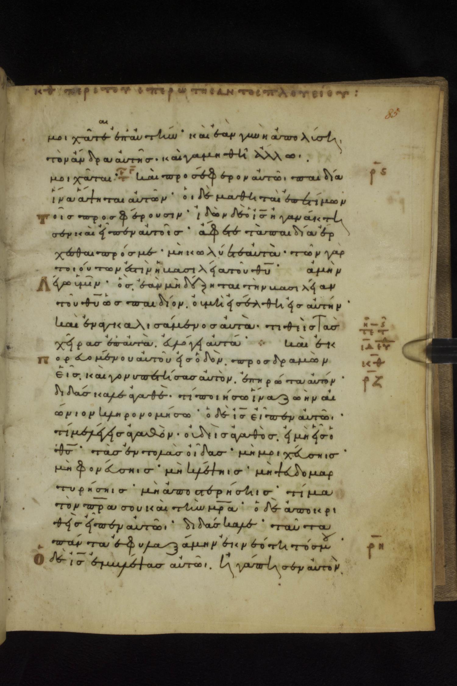 Eleventh century minuscule of the Gospels on parchment; 231 leaves, 1 column, 24 lines per column. Images were taken at the National Library of Greece in Athens.