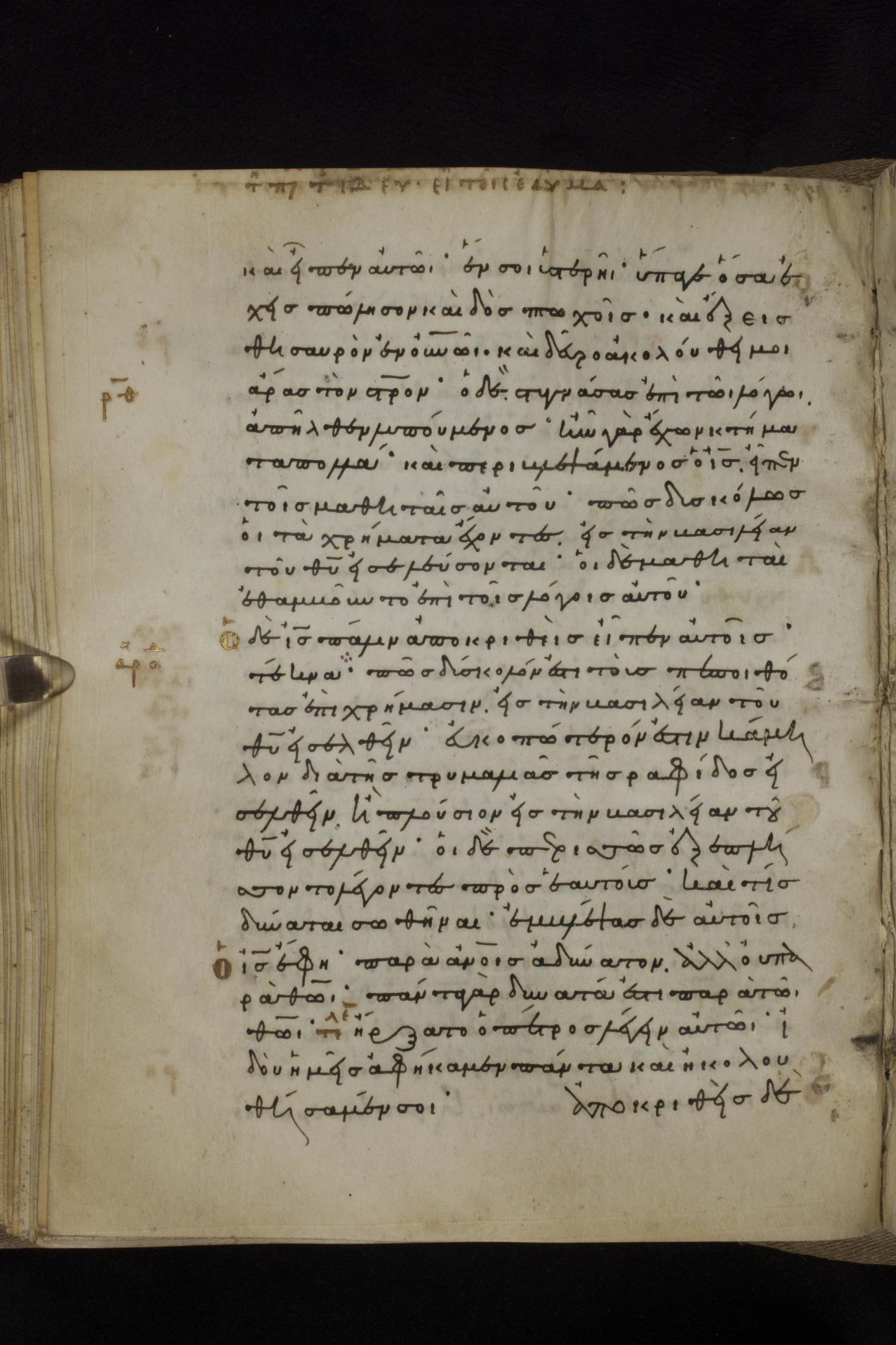 Eleventh century minuscule of the Gospels on parchment; 231 leaves, 1 column, 24 lines per column. Images were taken at the National Library of Greece in Athens.