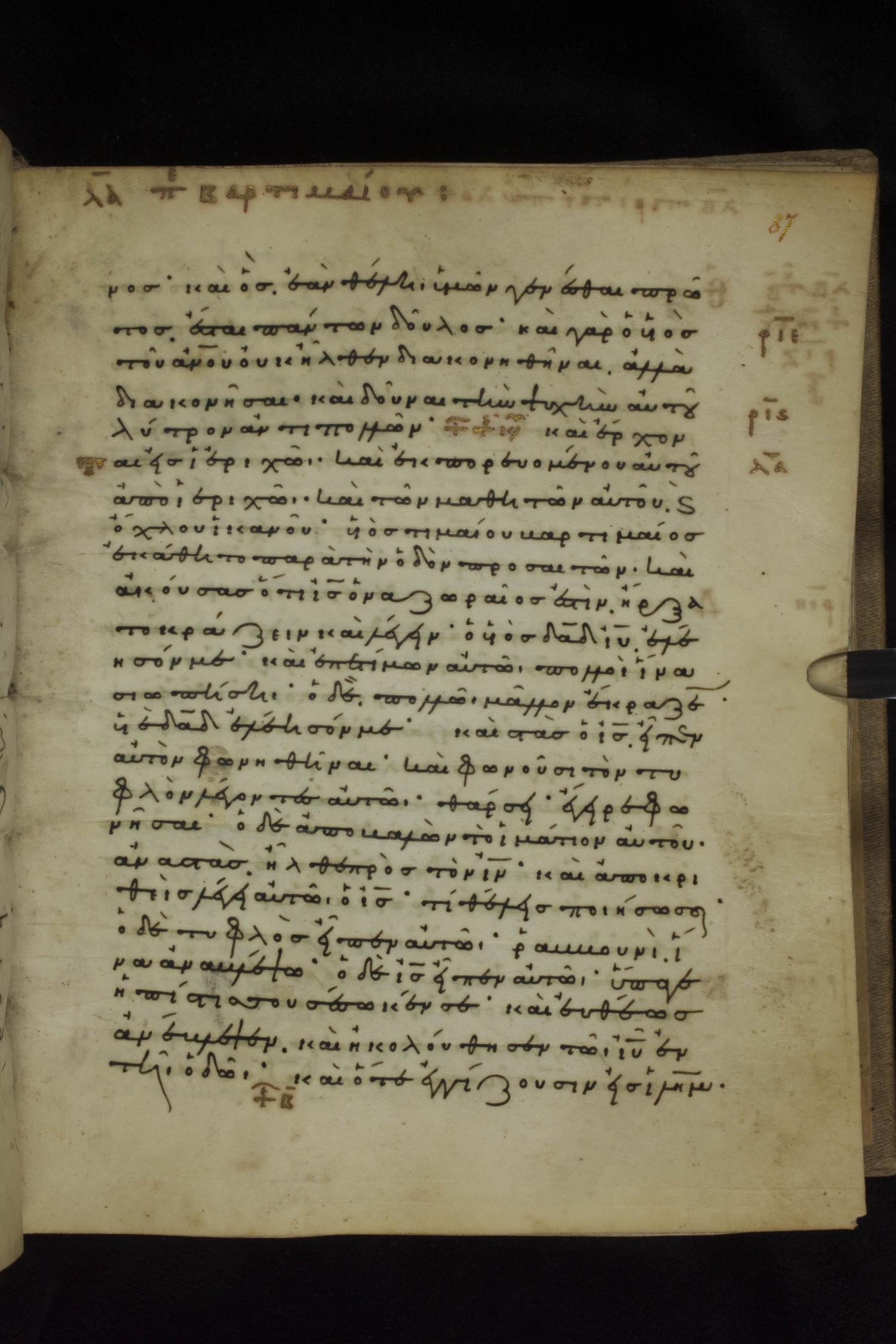 Eleventh century minuscule of the Gospels on parchment; 231 leaves, 1 column, 24 lines per column. Images were taken at the National Library of Greece in Athens.