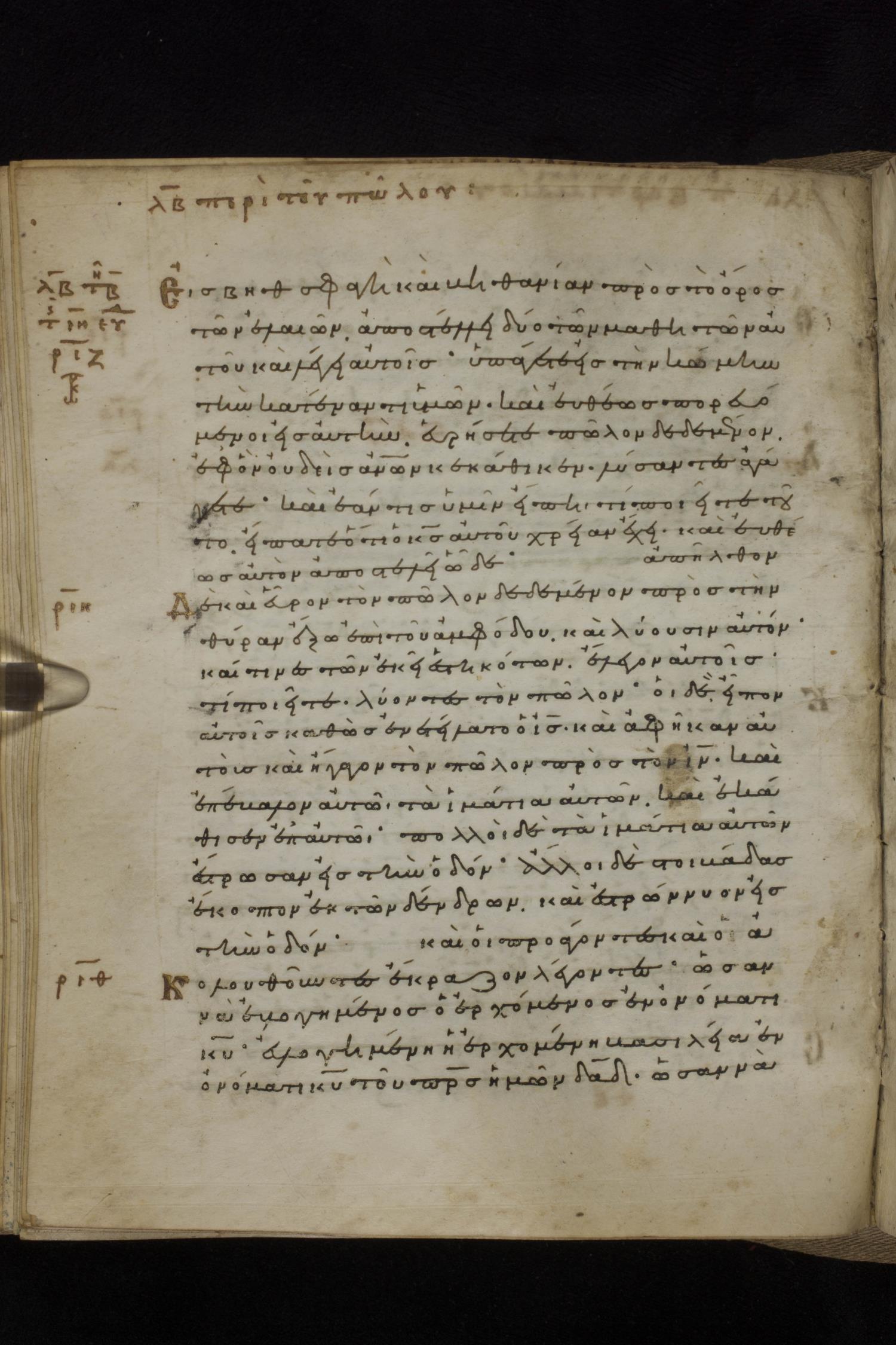 Eleventh century minuscule of the Gospels on parchment; 231 leaves, 1 column, 24 lines per column. Images were taken at the National Library of Greece in Athens.