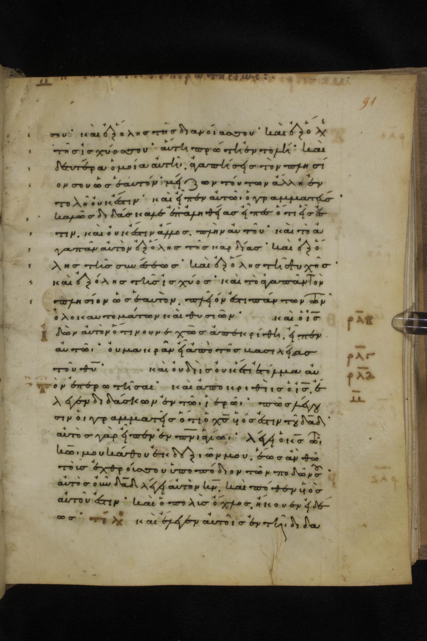 Eleventh century minuscule of the Gospels on parchment; 231 leaves, 1 column, 24 lines per column. Images were taken at the National Library of Greece in Athens.
