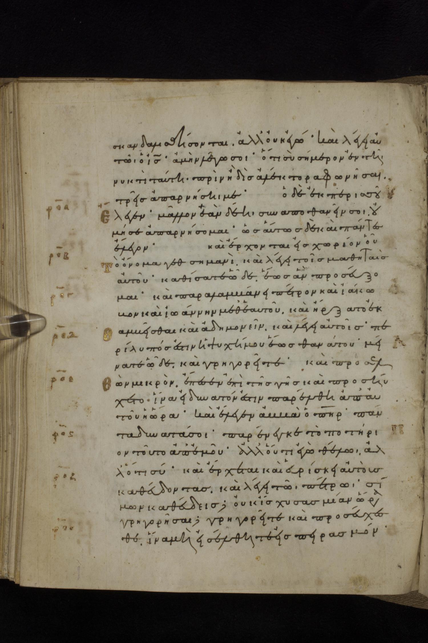 Eleventh century minuscule of the Gospels on parchment; 231 leaves, 1 column, 24 lines per column. Images were taken at the National Library of Greece in Athens.