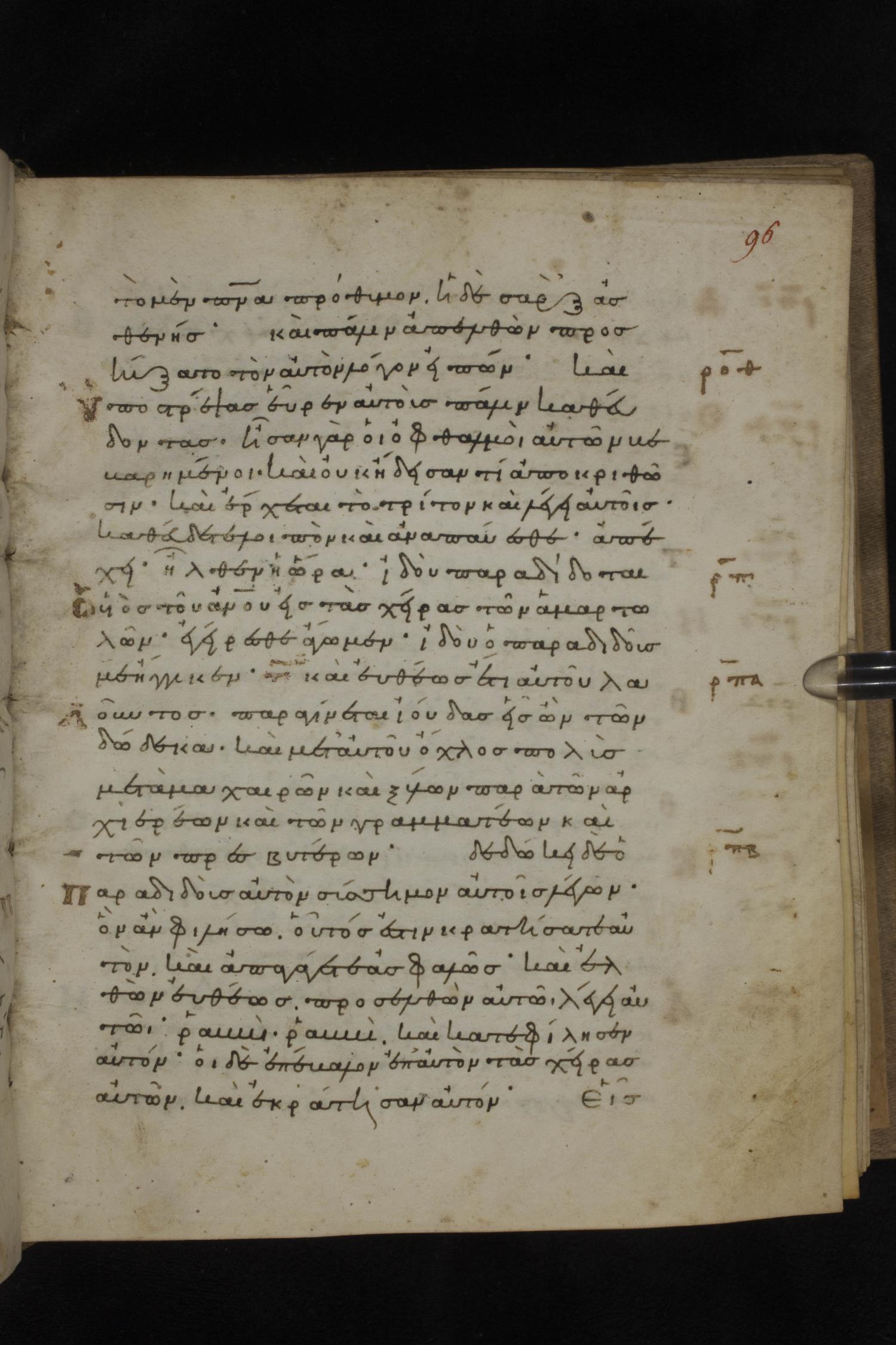 Eleventh century minuscule of the Gospels on parchment; 231 leaves, 1 column, 24 lines per column. Images were taken at the National Library of Greece in Athens.