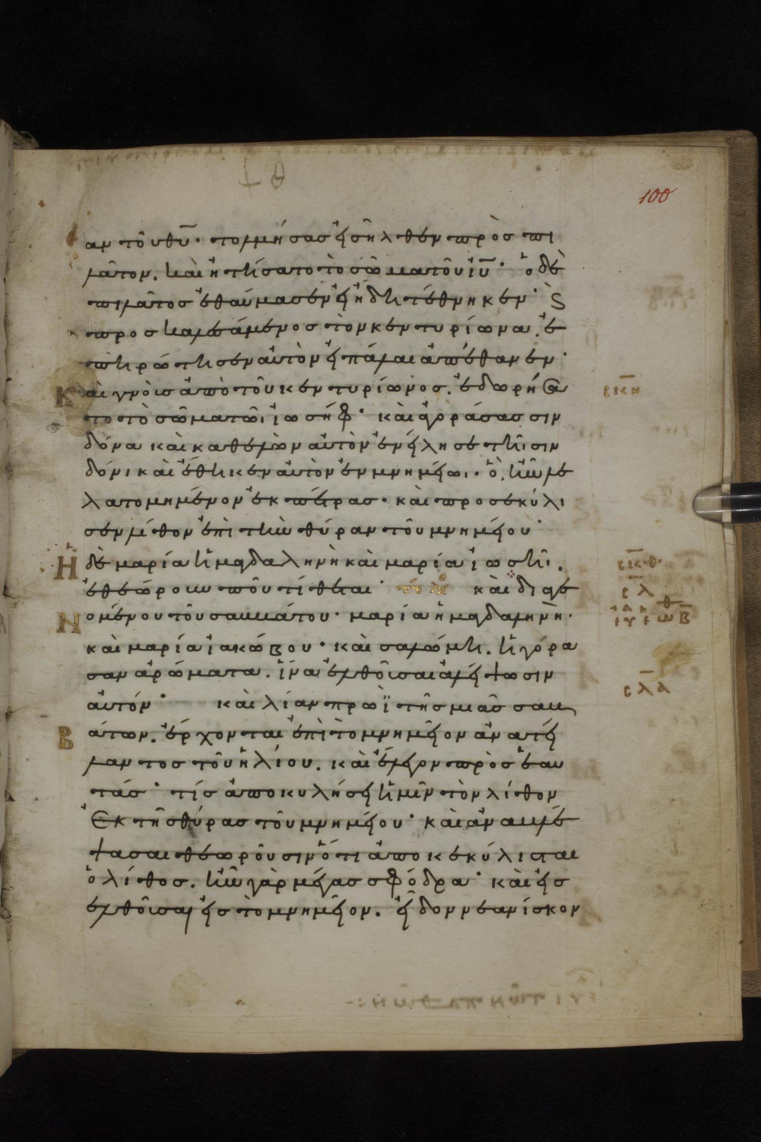 Eleventh century minuscule of the Gospels on parchment; 231 leaves, 1 column, 24 lines per column. Images were taken at the National Library of Greece in Athens.