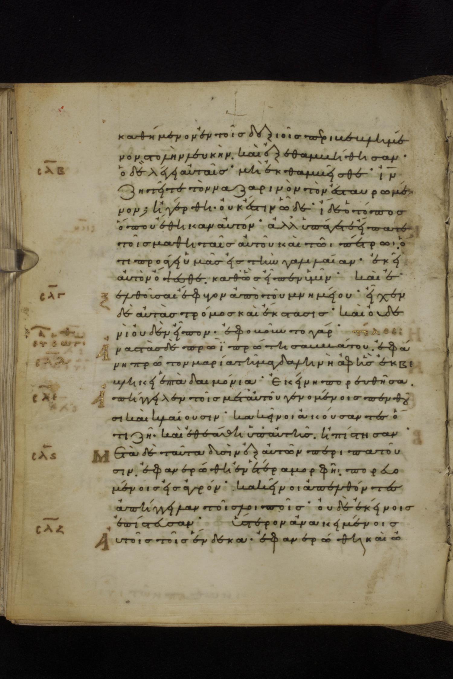Eleventh century minuscule of the Gospels on parchment; 231 leaves, 1 column, 24 lines per column. Images were taken at the National Library of Greece in Athens.