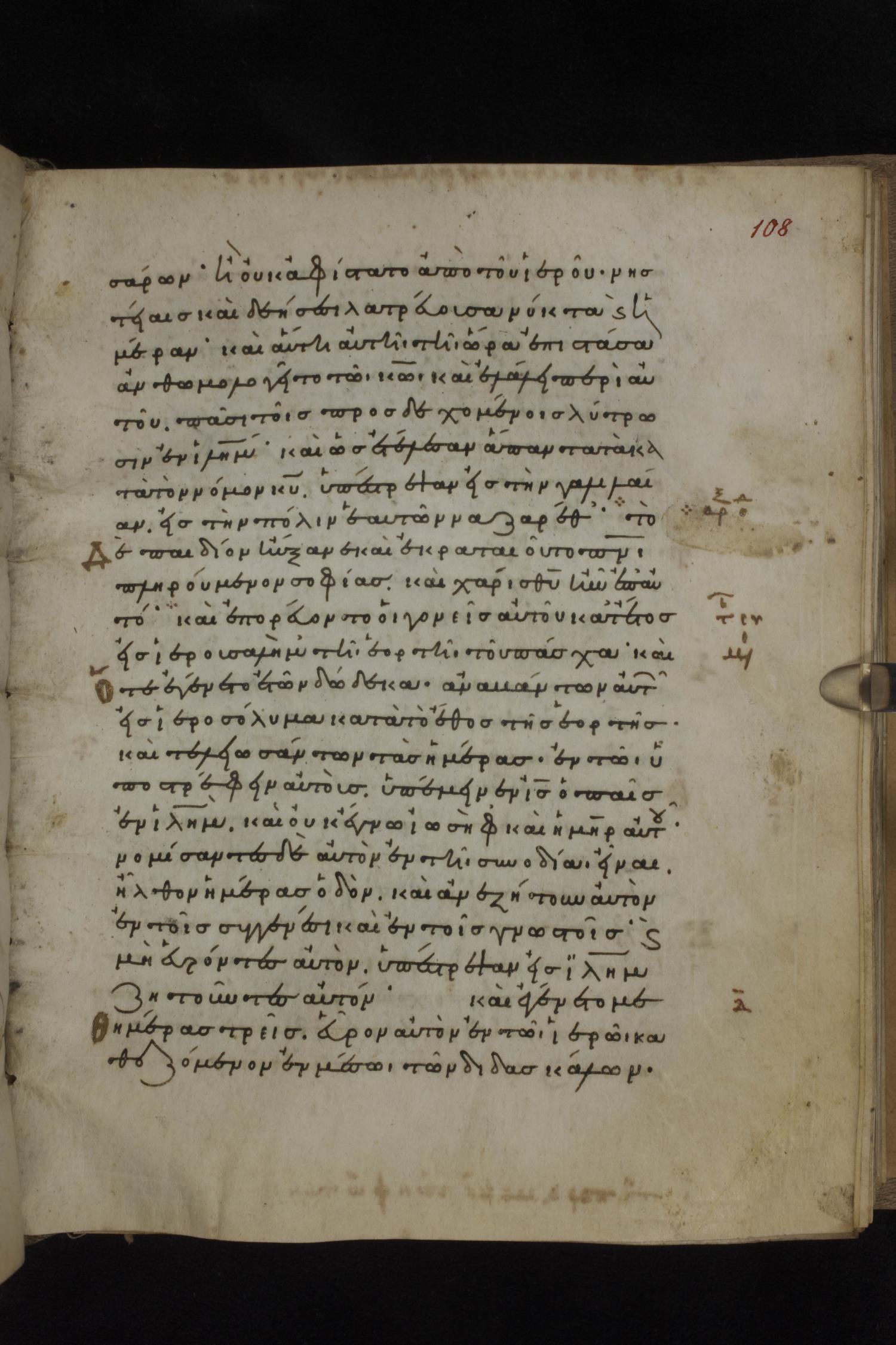 Eleventh century minuscule of the Gospels on parchment; 231 leaves, 1 column, 24 lines per column. Images were taken at the National Library of Greece in Athens.