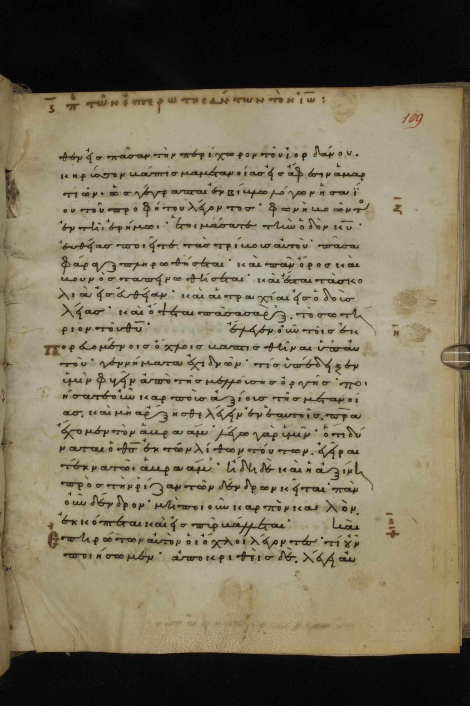 Eleventh century minuscule of the Gospels on parchment; 231 leaves, 1 column, 24 lines per column. Images were taken at the National Library of Greece in Athens.