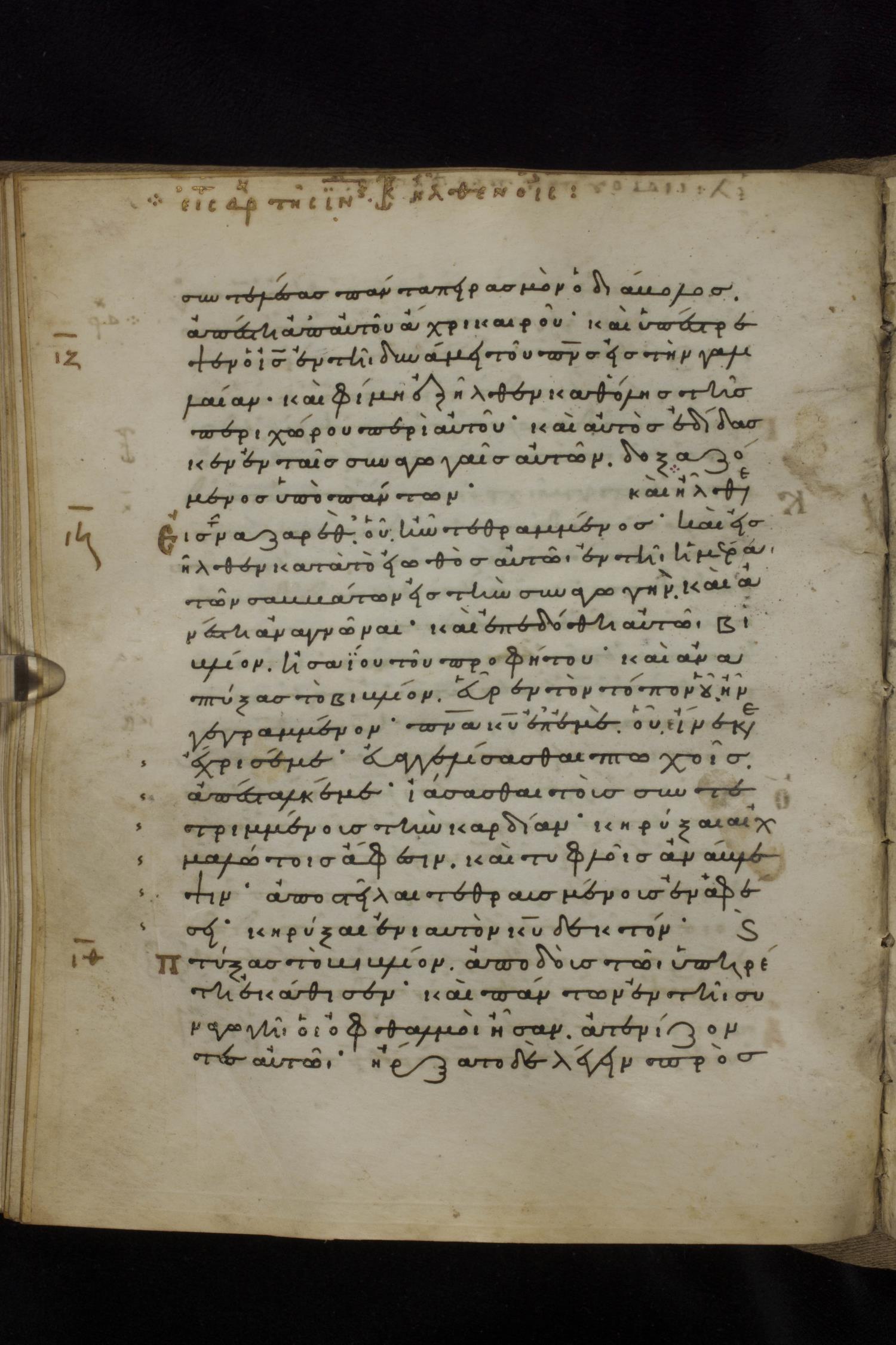 Eleventh century minuscule of the Gospels on parchment; 231 leaves, 1 column, 24 lines per column. Images were taken at the National Library of Greece in Athens.