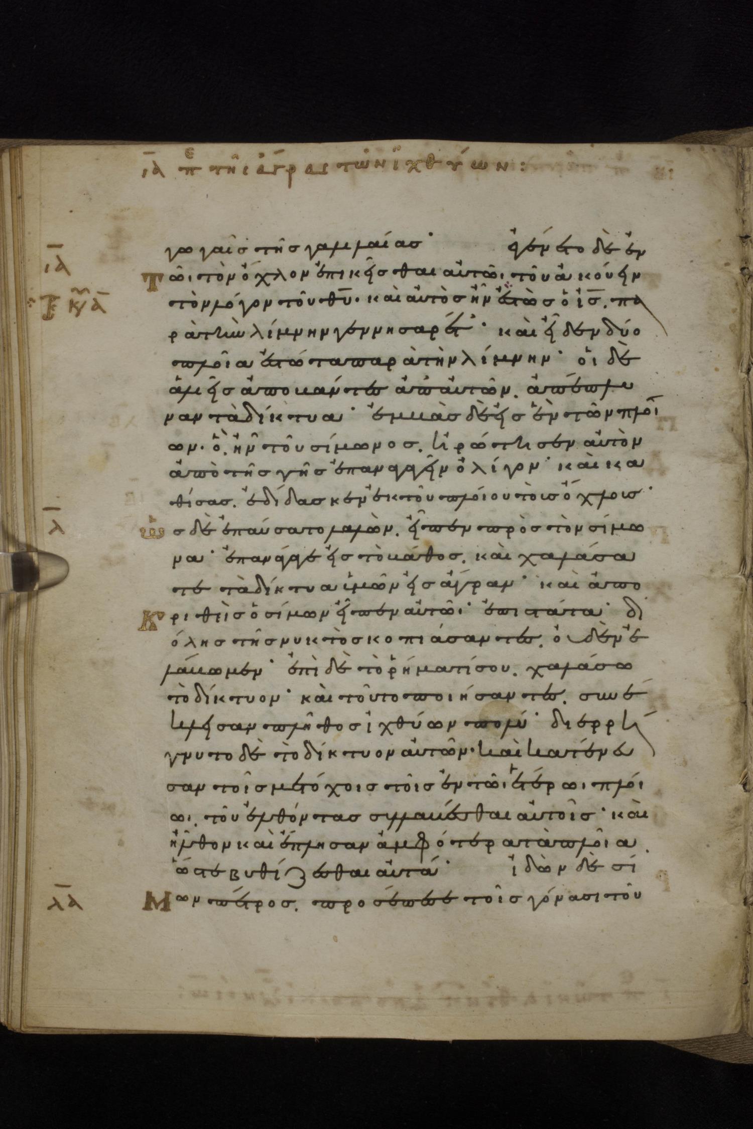 Eleventh century minuscule of the Gospels on parchment; 231 leaves, 1 column, 24 lines per column. Images were taken at the National Library of Greece in Athens.