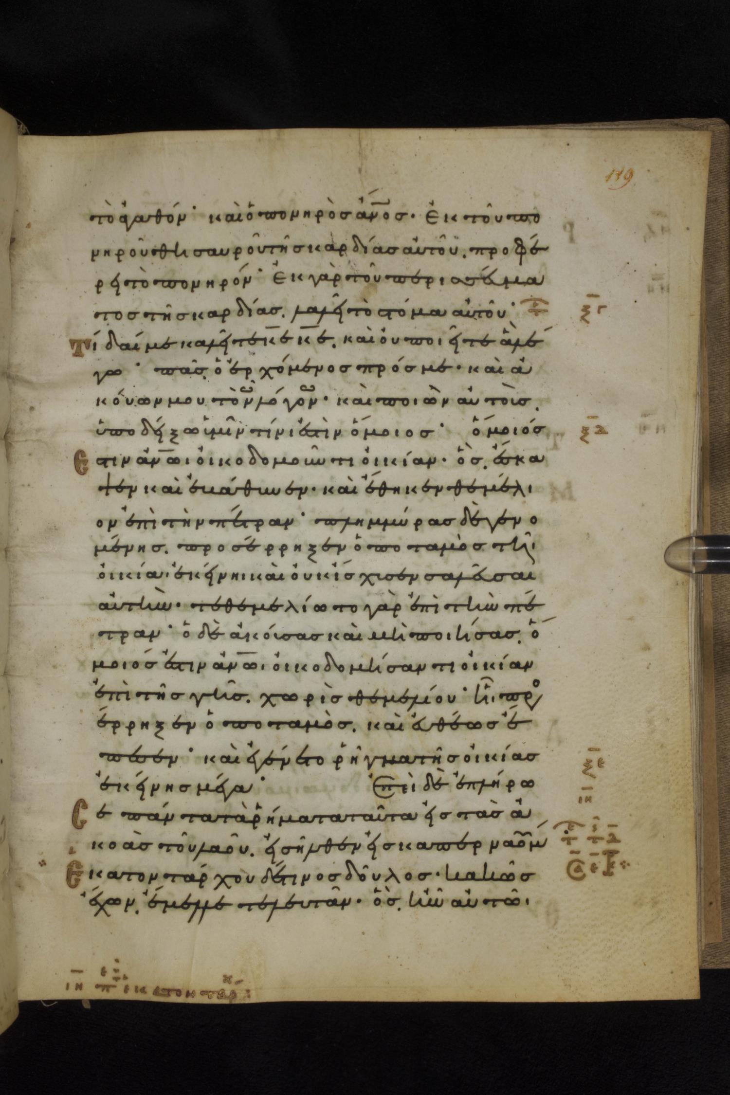 Eleventh century minuscule of the Gospels on parchment; 231 leaves, 1 column, 24 lines per column. Images were taken at the National Library of Greece in Athens.