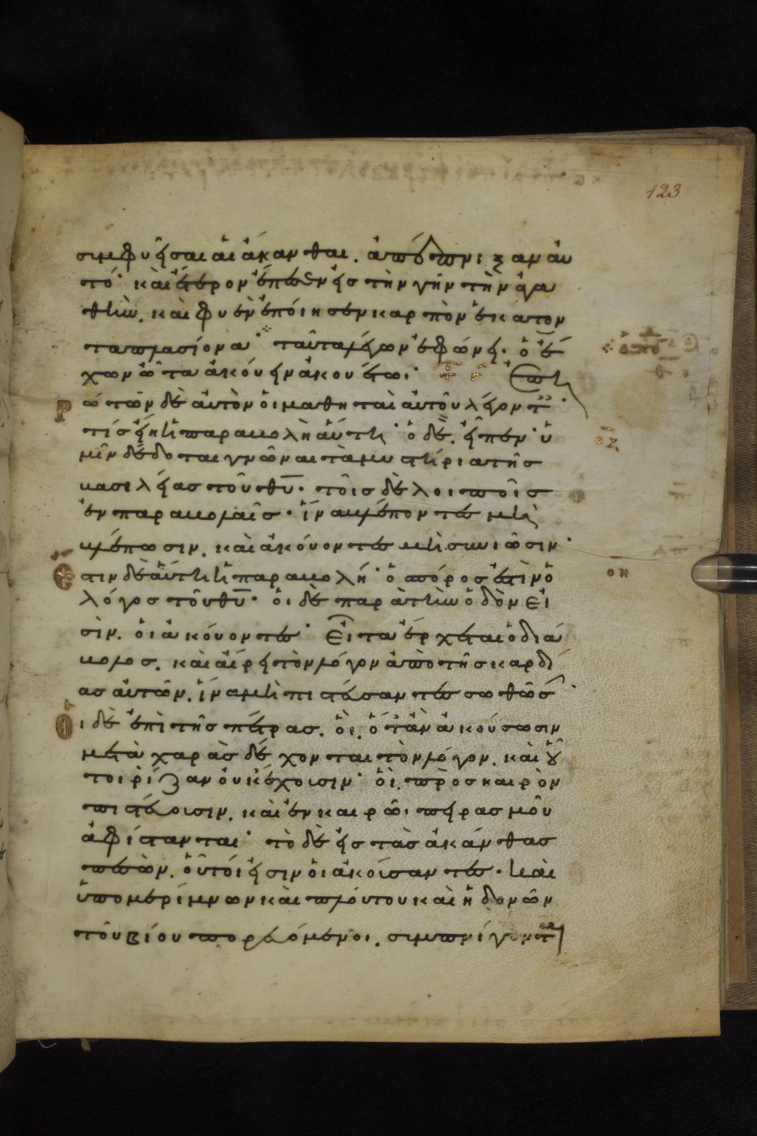 Eleventh century minuscule of the Gospels on parchment; 231 leaves, 1 column, 24 lines per column. Images were taken at the National Library of Greece in Athens.