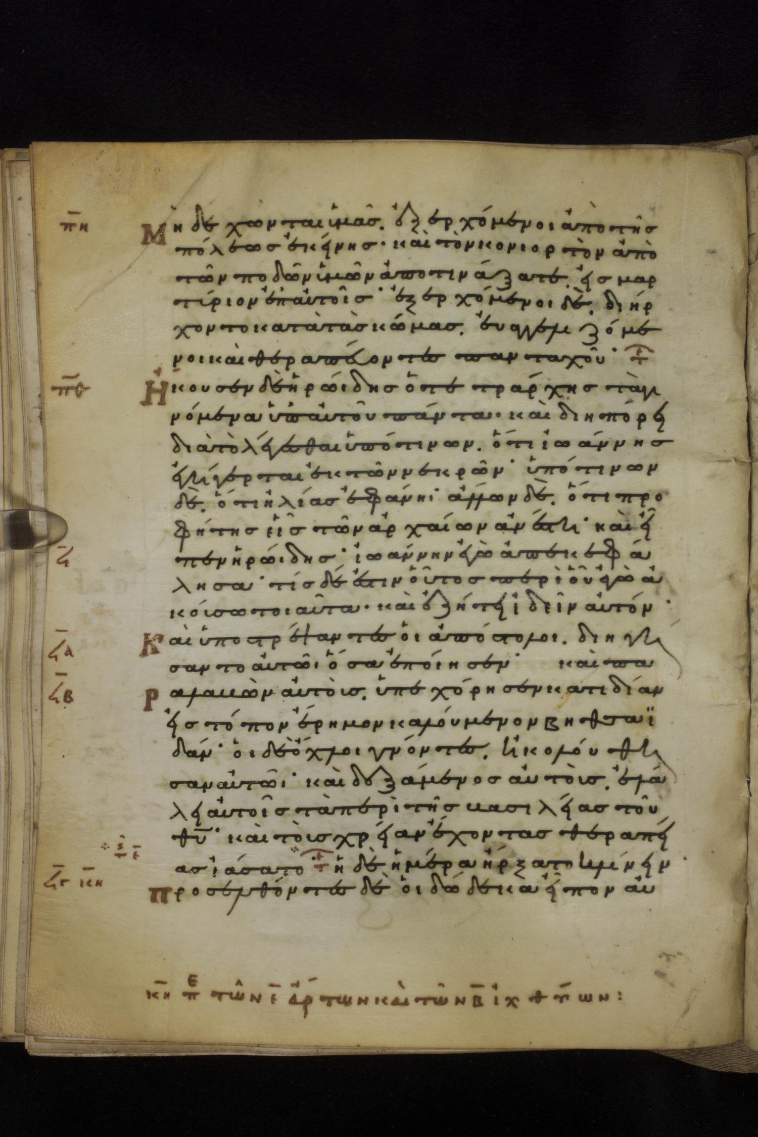 Eleventh century minuscule of the Gospels on parchment; 231 leaves, 1 column, 24 lines per column. Images were taken at the National Library of Greece in Athens.