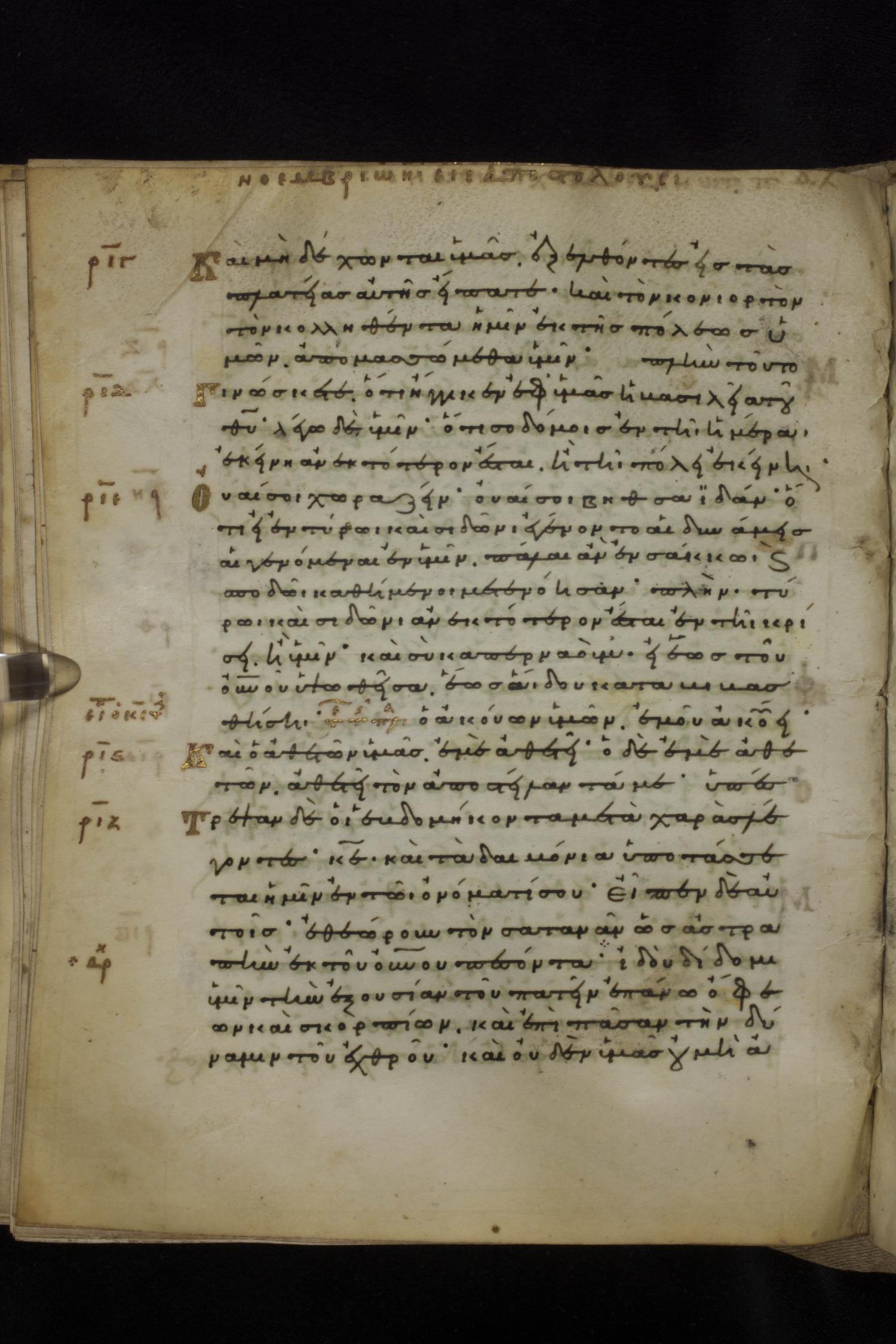 Eleventh century minuscule of the Gospels on parchment; 231 leaves, 1 column, 24 lines per column. Images were taken at the National Library of Greece in Athens.