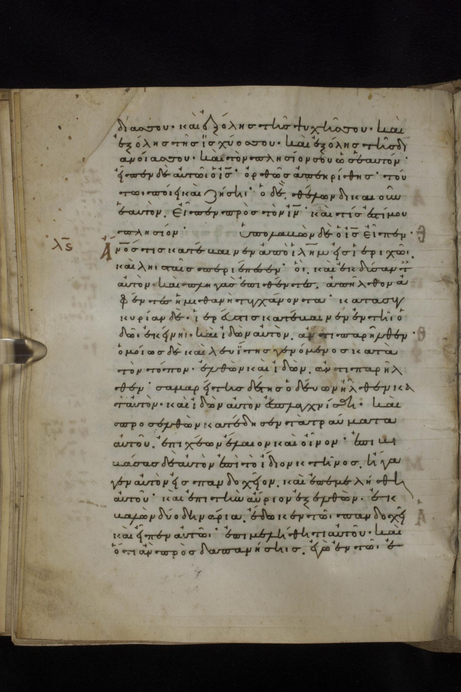 Eleventh century minuscule of the Gospels on parchment; 231 leaves, 1 column, 24 lines per column. Images were taken at the National Library of Greece in Athens.