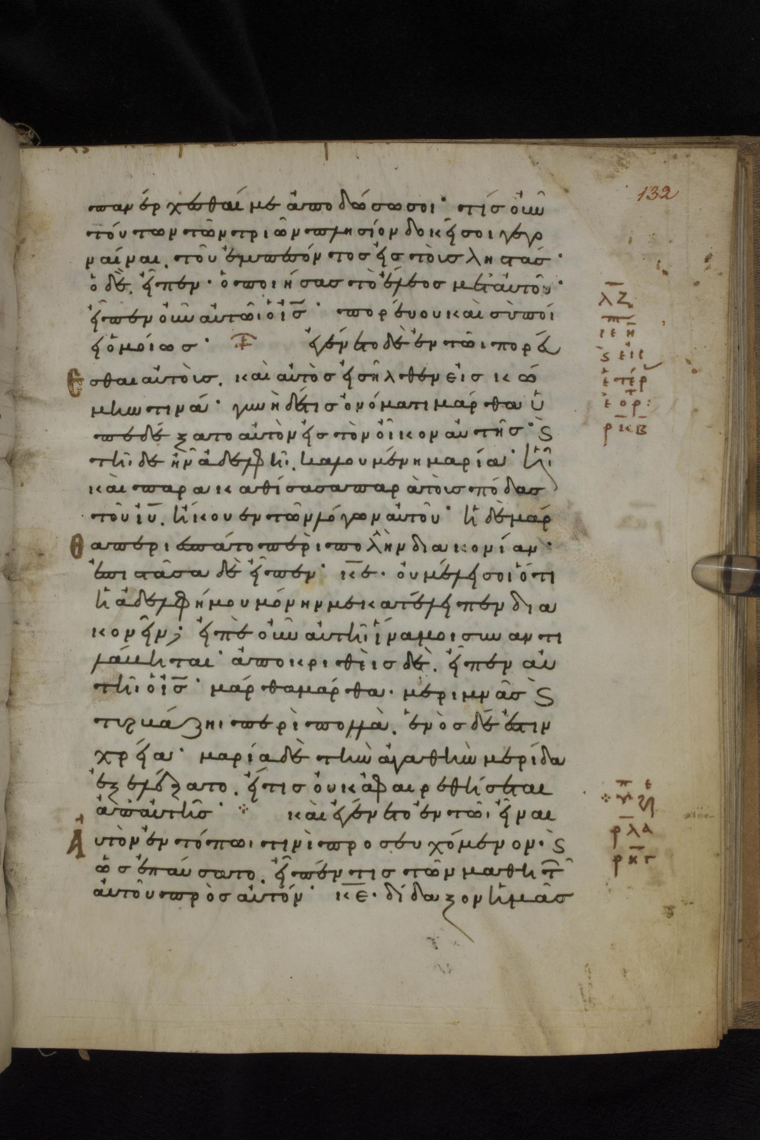 Eleventh century minuscule of the Gospels on parchment; 231 leaves, 1 column, 24 lines per column. Images were taken at the National Library of Greece in Athens.