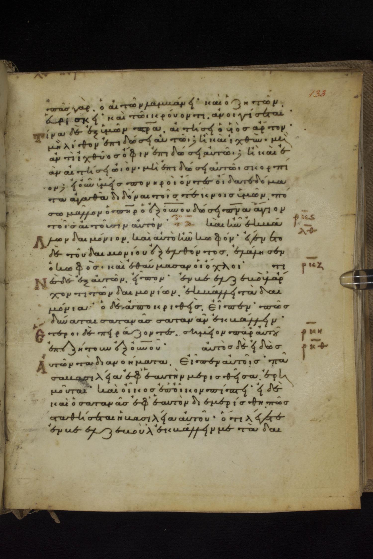 Eleventh century minuscule of the Gospels on parchment; 231 leaves, 1 column, 24 lines per column. Images were taken at the National Library of Greece in Athens.