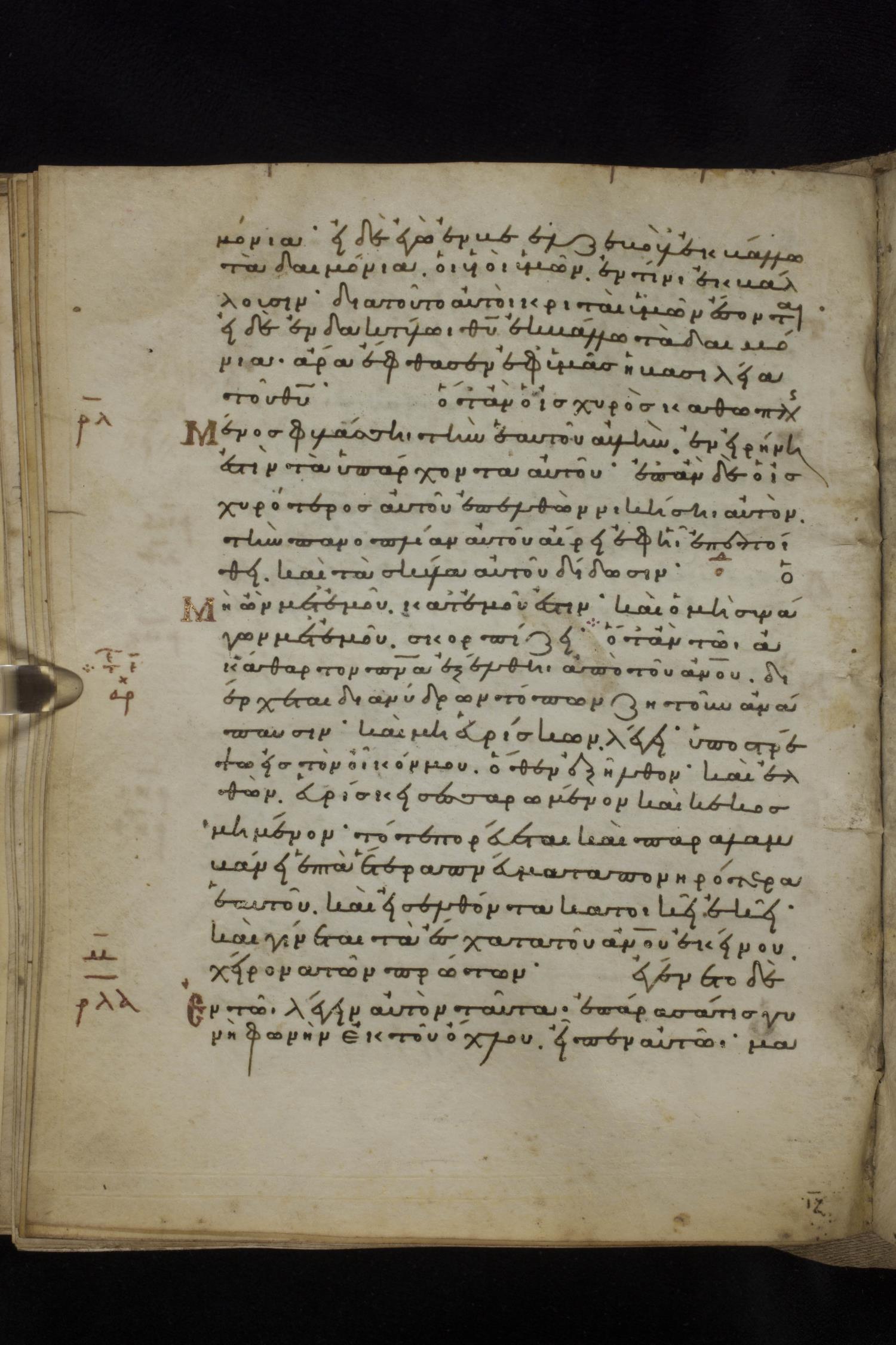 Eleventh century minuscule of the Gospels on parchment; 231 leaves, 1 column, 24 lines per column. Images were taken at the National Library of Greece in Athens.