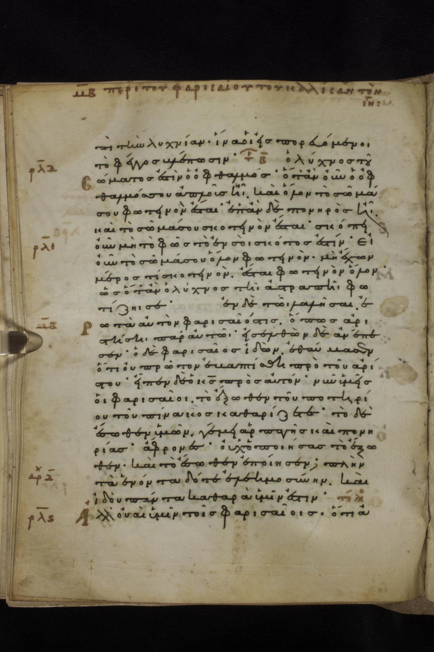 Eleventh century minuscule of the Gospels on parchment; 231 leaves, 1 column, 24 lines per column. Images were taken at the National Library of Greece in Athens.