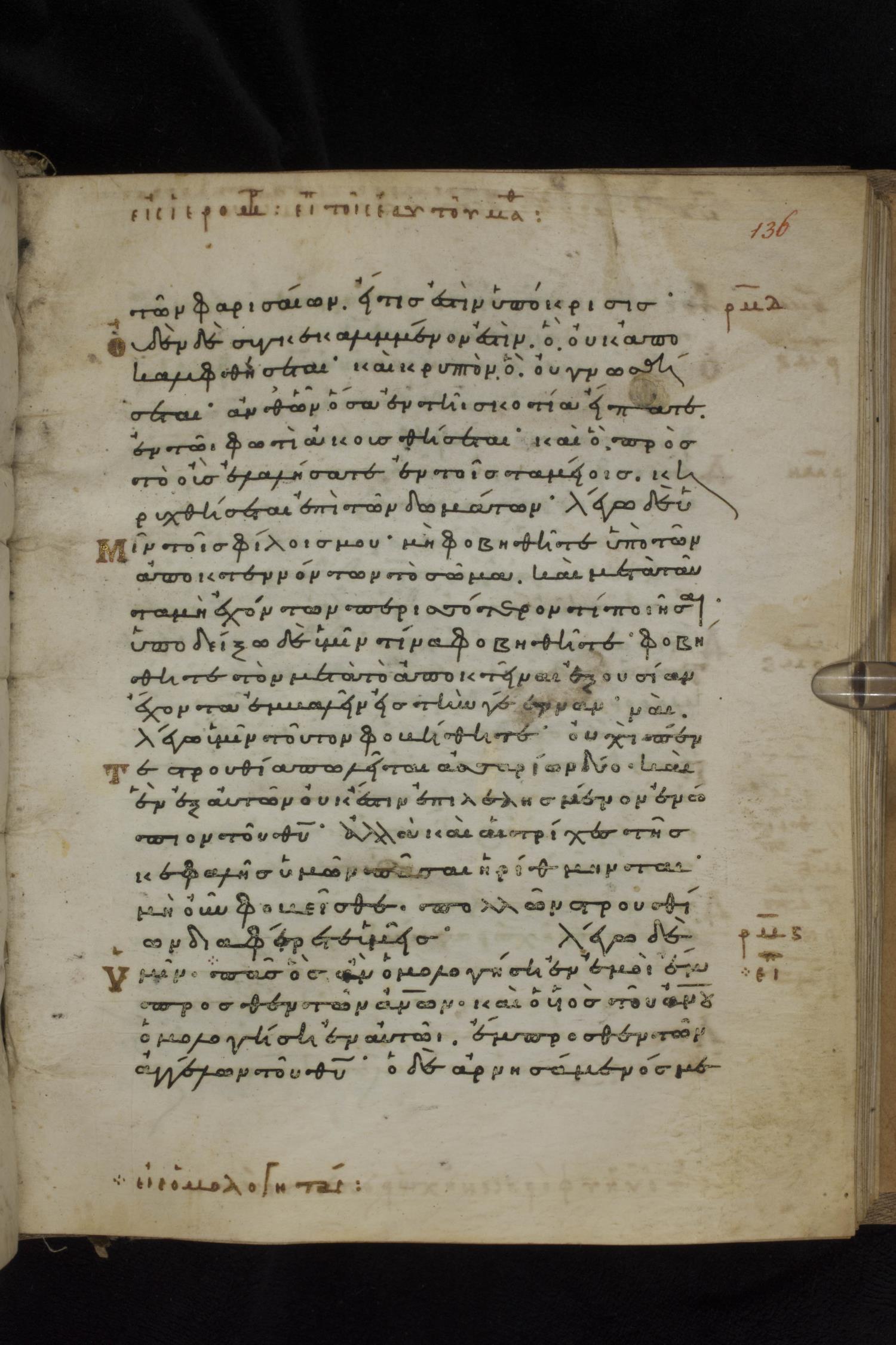 Eleventh century minuscule of the Gospels on parchment; 231 leaves, 1 column, 24 lines per column. Images were taken at the National Library of Greece in Athens.