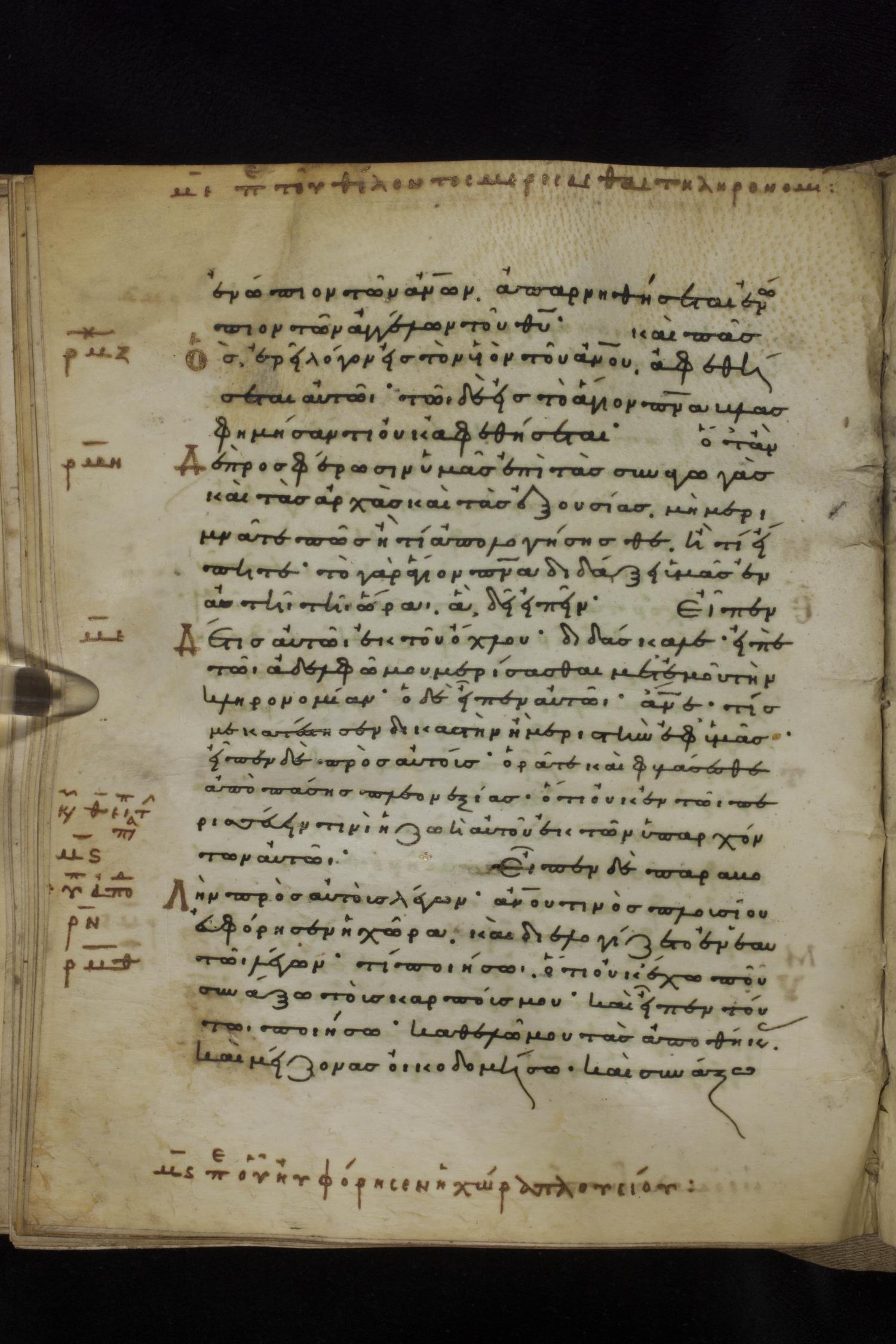 Eleventh century minuscule of the Gospels on parchment; 231 leaves, 1 column, 24 lines per column. Images were taken at the National Library of Greece in Athens.