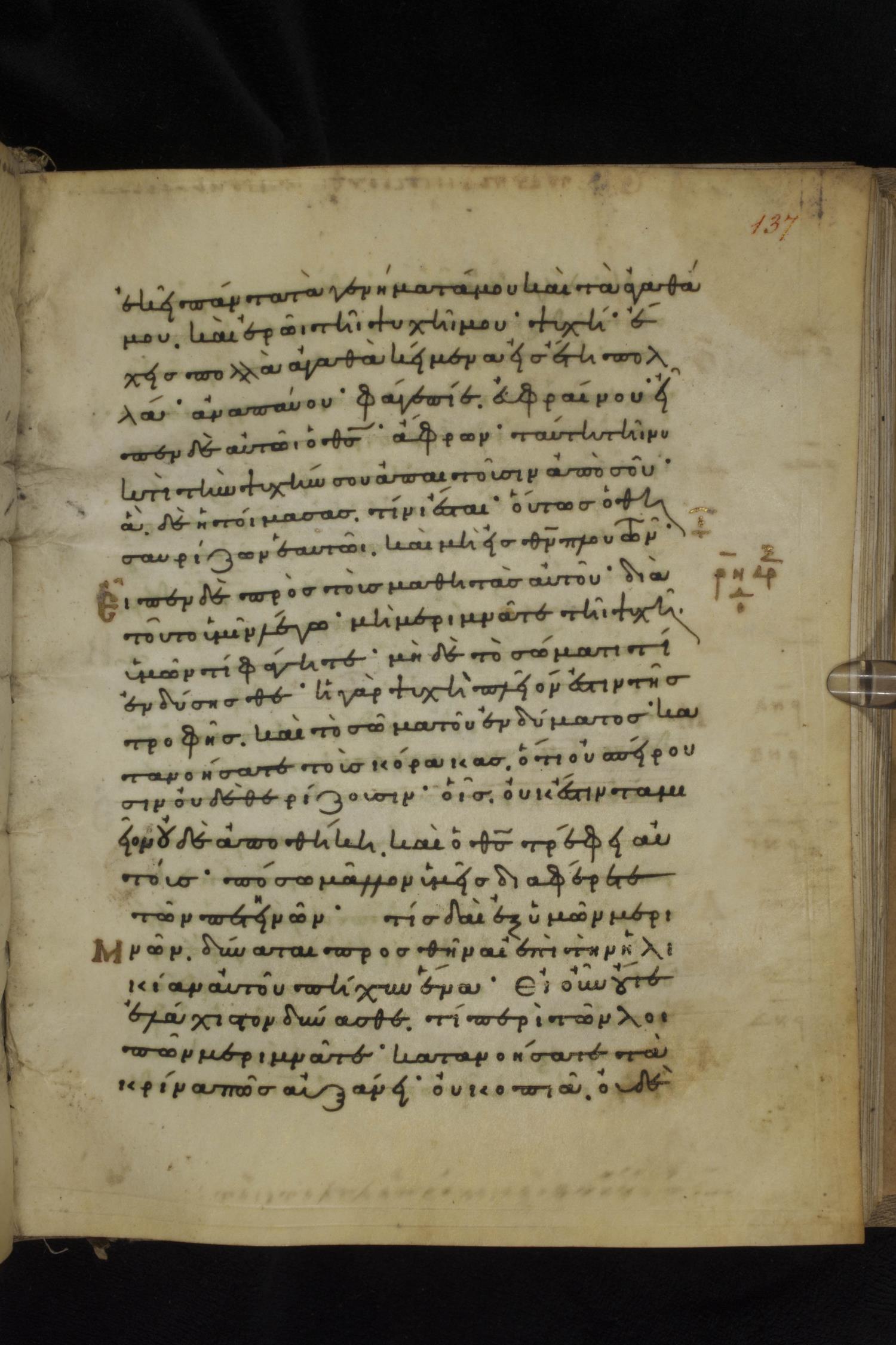Eleventh century minuscule of the Gospels on parchment; 231 leaves, 1 column, 24 lines per column. Images were taken at the National Library of Greece in Athens.